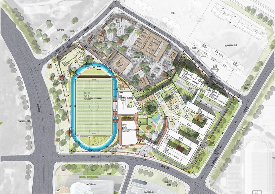 The two-way stepped terraces of the Science and Innovation Building form a visual connection with the folk culture park and the wetland park — not only linking the folk culture park (east) and the wetland park (west) in terms of urban spatial form, but also serving as a quiet corner for teachers and students to reflect or meditate during breaks. Two ancient banyan trees on the site have been fully preserved: one, in front of the teaching building, serves as an important focal point at the main entrance of the campus, where the large curve of the teaching building also ends; the other stands between the Science and Innovation Building and the track, its branches and leaves drooping like an umbrella over the track, becoming a key spatial node in the northwest corner of the campus.