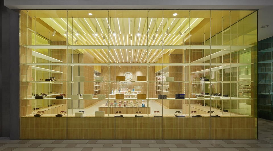 空间材质的选择极为简洁,涵盖天花铝板,小块瓷砖与幕墙玻璃等。几种日常而朴实的材料,通过比例与组合的控制,生成了细腻的触感与层次。设计师将统一的系统逻辑贯穿于天花、墙面、地面与陈列道具四个主要空间元素,并为其赋予相应的色彩。由于各陈列区间距仅2米且呈串联布局,色彩的过渡被处理得如同水彩晕染——饱和度被适度收敛,使色调在不同材质与界面间自然流淌。即便是同一色系,亦能展现丰富的层次与呼吸感。