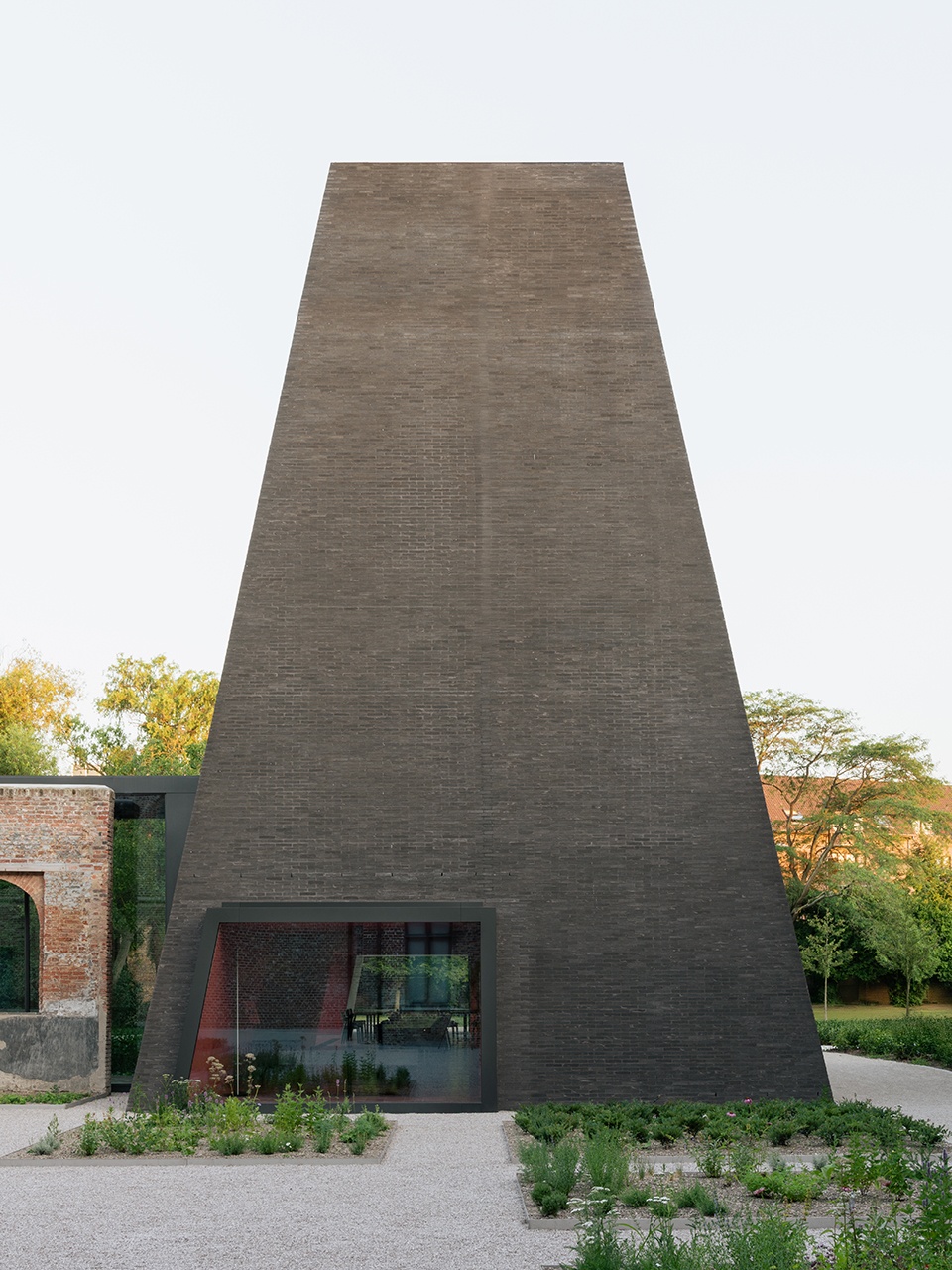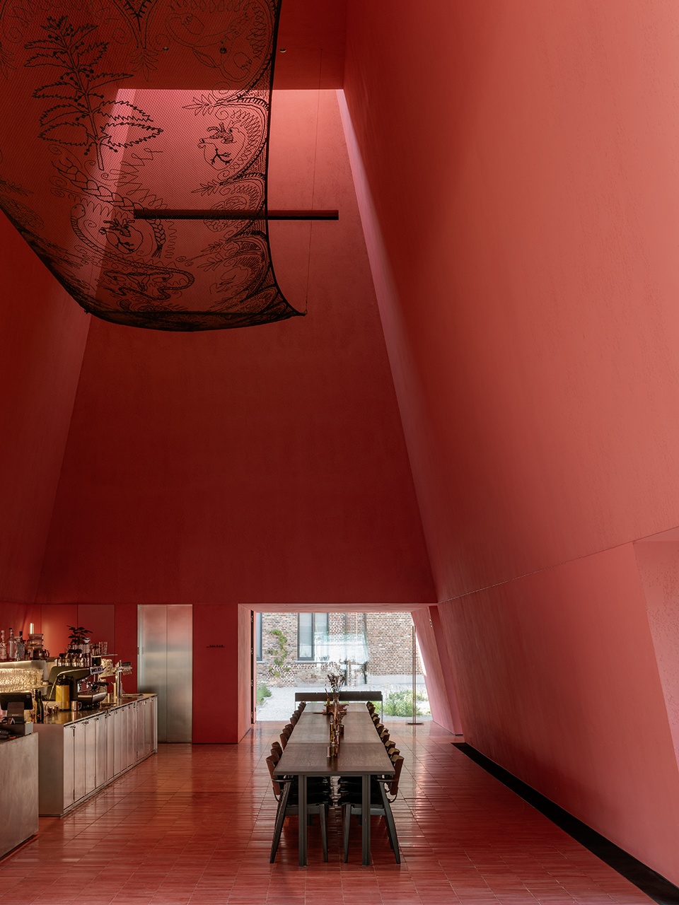 The pavilion, connected to the complex through the former dormitory building, houses a bar and restaurant. Its inclined facades create a welcoming, sheltered atmosphere while maximizing space inside. Here a long table can be arranged, referencing the communal refectory of an abbey.