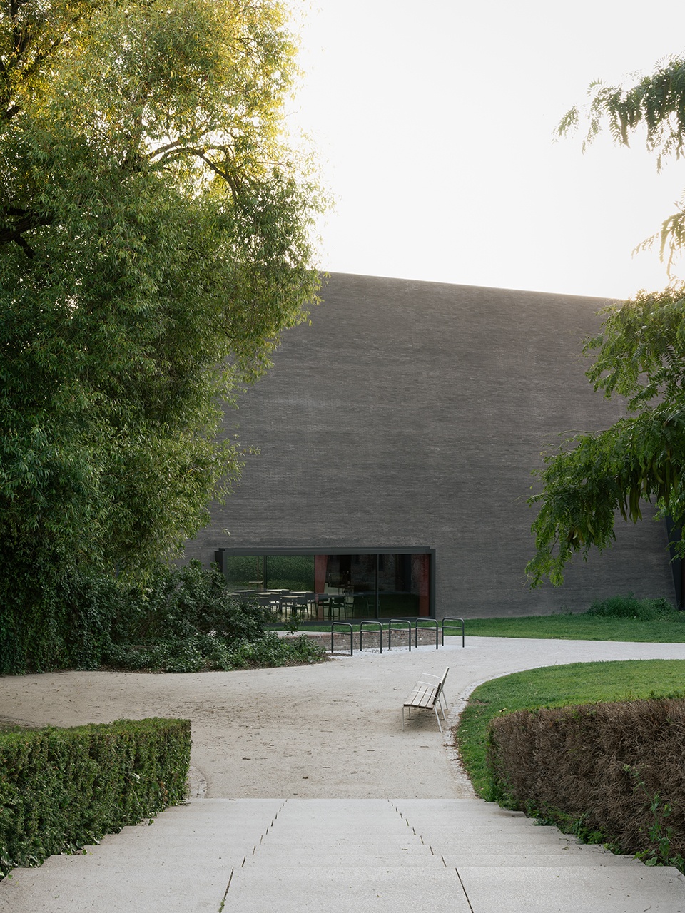 While the exhibition area is located below the complex, the distinctive presence of the new park pavilion establishes a dialogue with the historic structures, both through its form, which evokes the verticality of their sloping roofs, and through the logic of its orthogonal arrangement. The new building comes as a clearly recognizable element in dialogue with the existing architecture; one more pavilion that continues the history of the urban composition. Its facades, covered in dark-coloured brick, give it the character of an independent element within the historical complex.