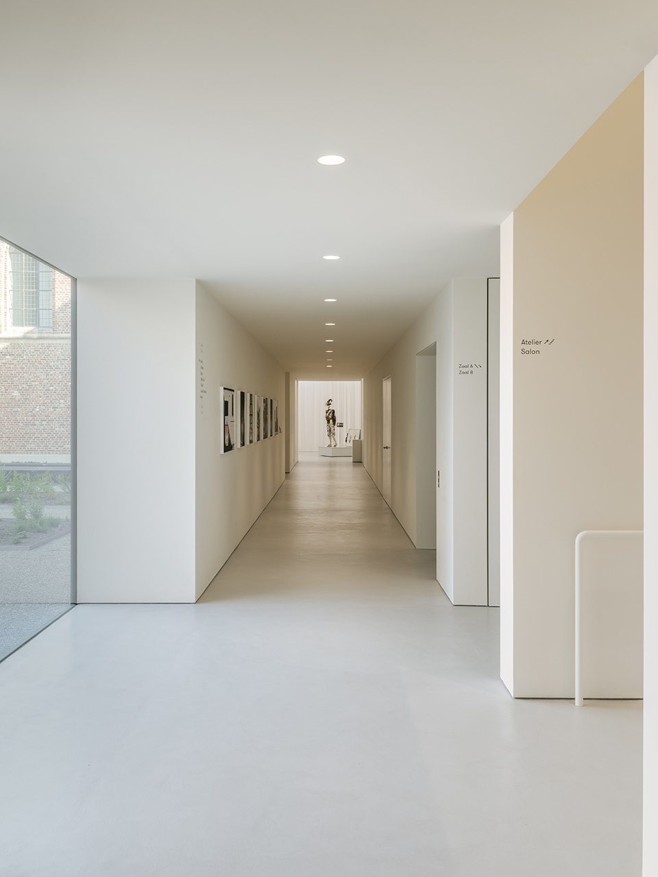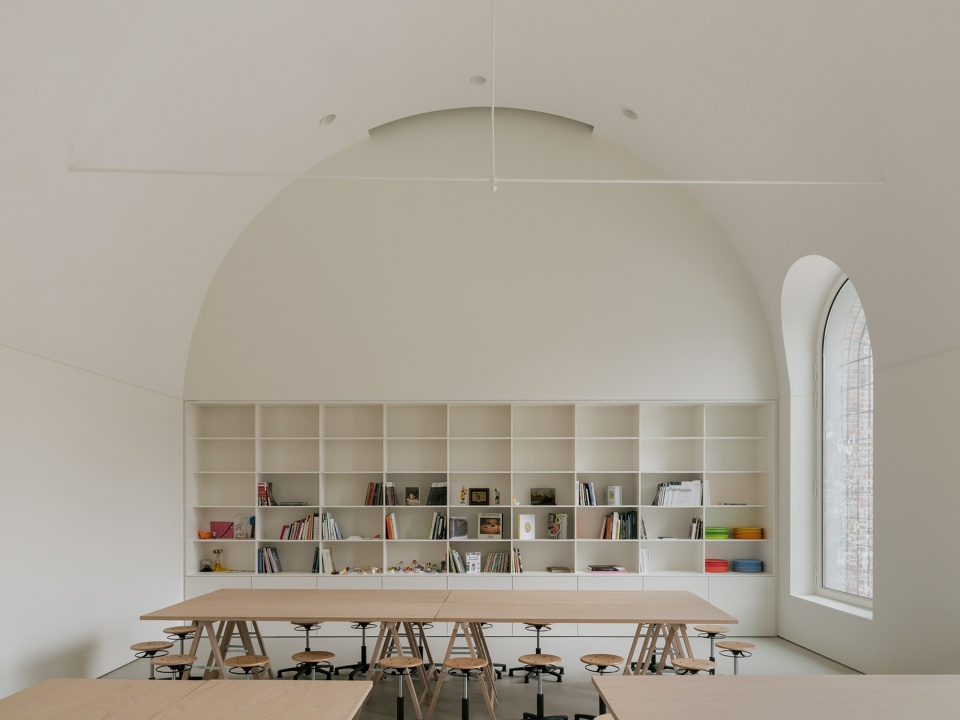 Minimal interventions were made to the former dormitory building, restoring the original windows, ceiling, and red terracotta floor. A long display case was added to showcase works from the city of Kortrijk, inviting artists to engage with the collection.