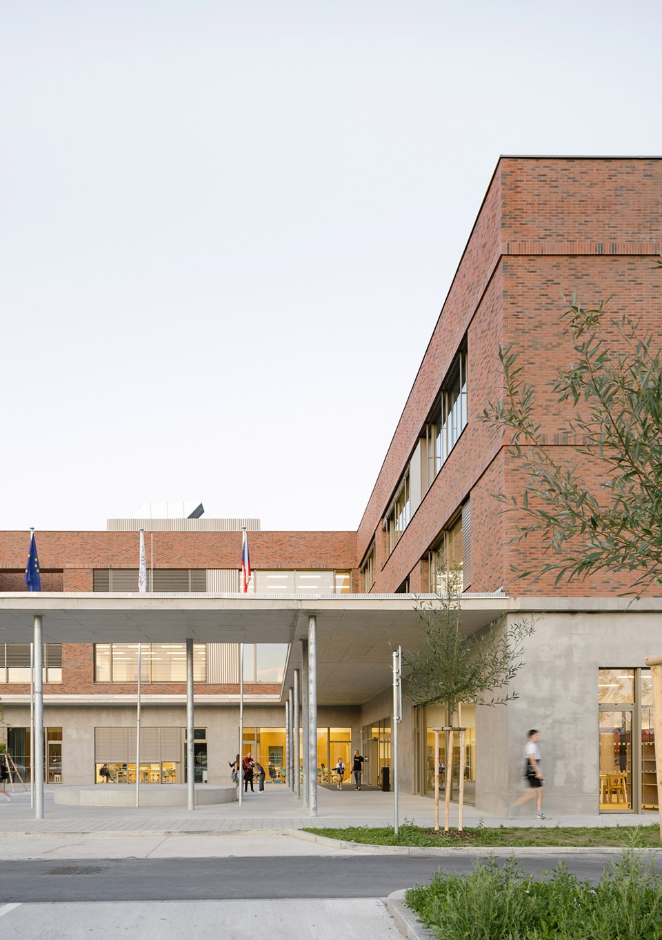 The school is designed to meet the energy performance class A. Heating is provided by heat pumps, and all spaces are equipped with controlled mechanical ventilation, while each occupied space can also be naturally ventilated through operable windows. The overall energy balance is enhanced by photovoltaic panels on the roofs of both the main school and the sports building, as well as by external shading, and high-quality thermal insulation. The building’s structure is reinforced concrete with masonry infill, contributing to the thermal mass and stability of the building. The exterior façade is clad in ceramic elements. Roof canopies along the façade and planted “tree nests” help to prevent the formation of heat islands.