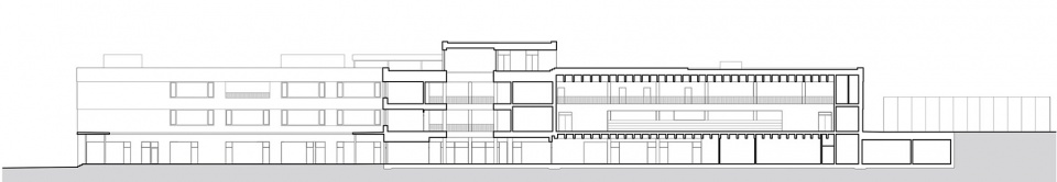 两个庭院——一个公共、一个私密——的概念定义了建筑的基本布局。北侧部分包含教室和主要公共空间,而南侧部分容纳体育设施、礼堂以及必要的辅助区域。学校共有三层,其高度构成呼应了地形的坡度。从地面层(从城镇中心抵达时)不仅可以直接进入场地,也可以从连接体育综合体的一层进入。三层设有一个户外教室,确保每一层都能直接通往室外。屋顶包括户外露台、教室以及用于园艺活动的种植床。