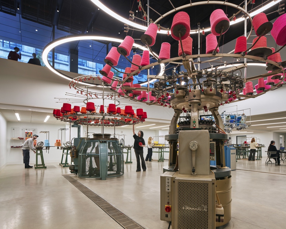 The building’s features include 26 energy-efficient classrooms and studios, administrative offices, and the largest campus knitting lab in the U.S. The space also houses FIT’s first interior space designed specifically for interpersonal connection outside the classroom—a full-floor student commons under a 20-foot-high ceiling, accessible via an express escalator. FIT’s commitment to environmental stewardship is reflected in the design and construction of the building, which is projected to attain LEED Gold certification.