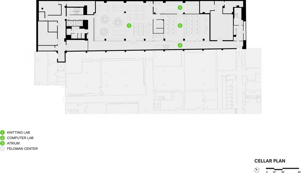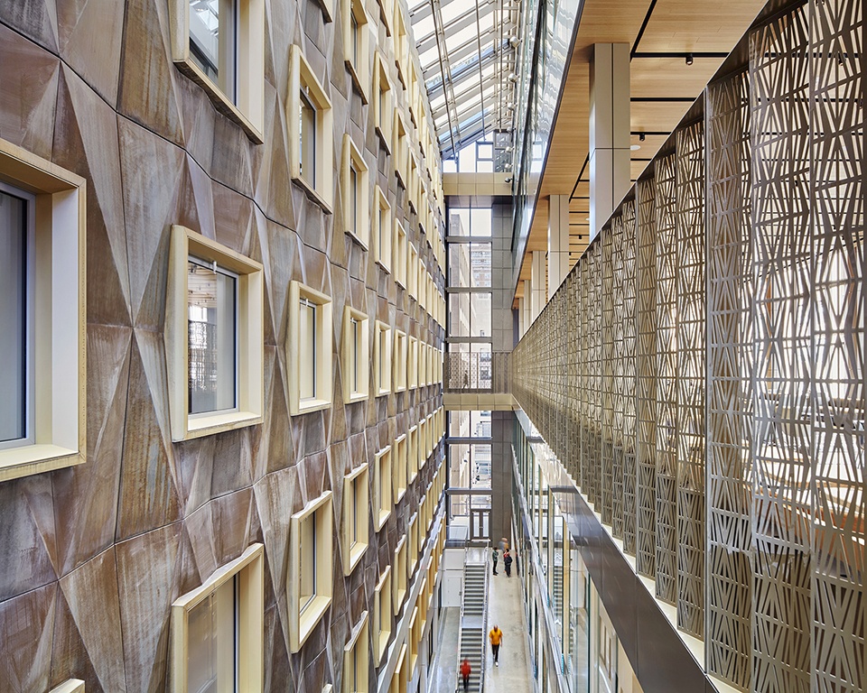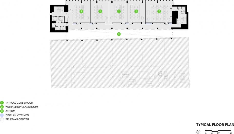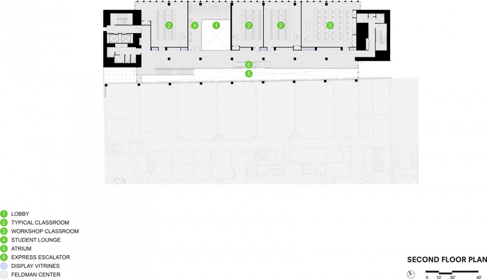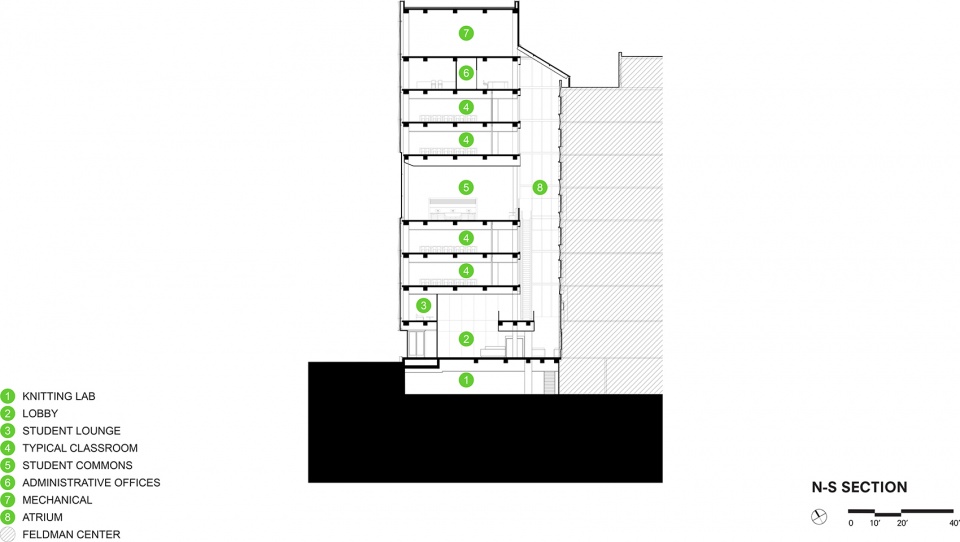 大楼内部包括26间高能效教室与工作室、行政办公空间,以及全美高校中最大的编织实验室。同时,建筑内首次设立了专为课堂外人际交流而设计的室内公共空间——一整层的学生共享区,层高达20英尺,并通过一条快速扶梯抵达FIT对环境管理的承诺也体现在建筑的设计与建造中,大楼预计将获得LEED金级认证。