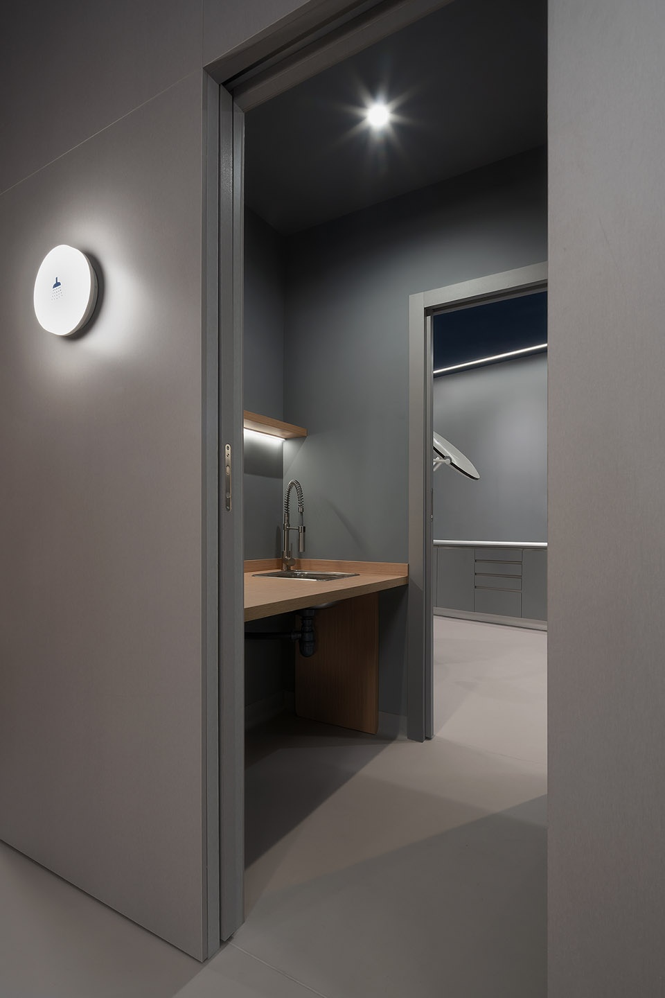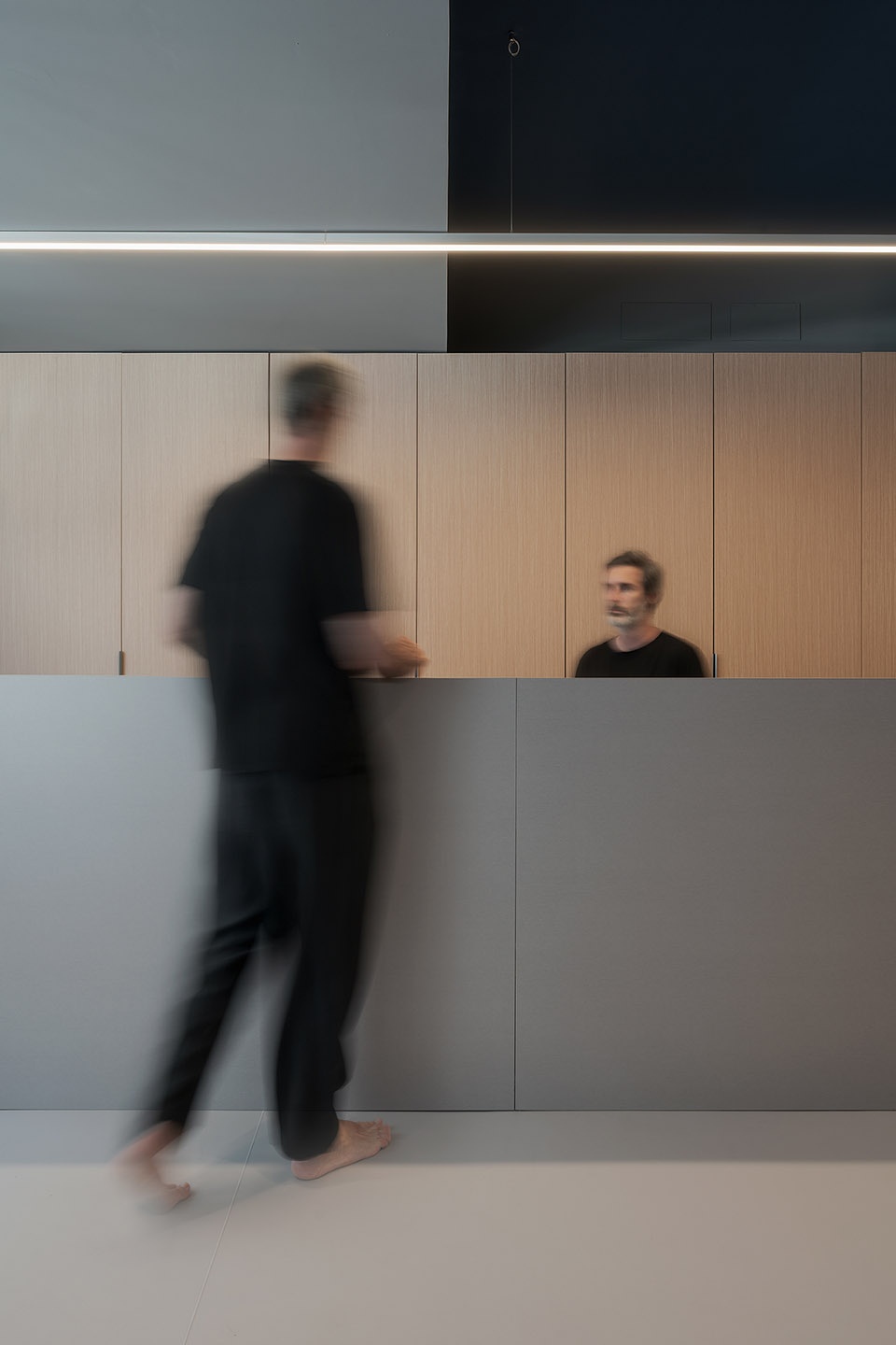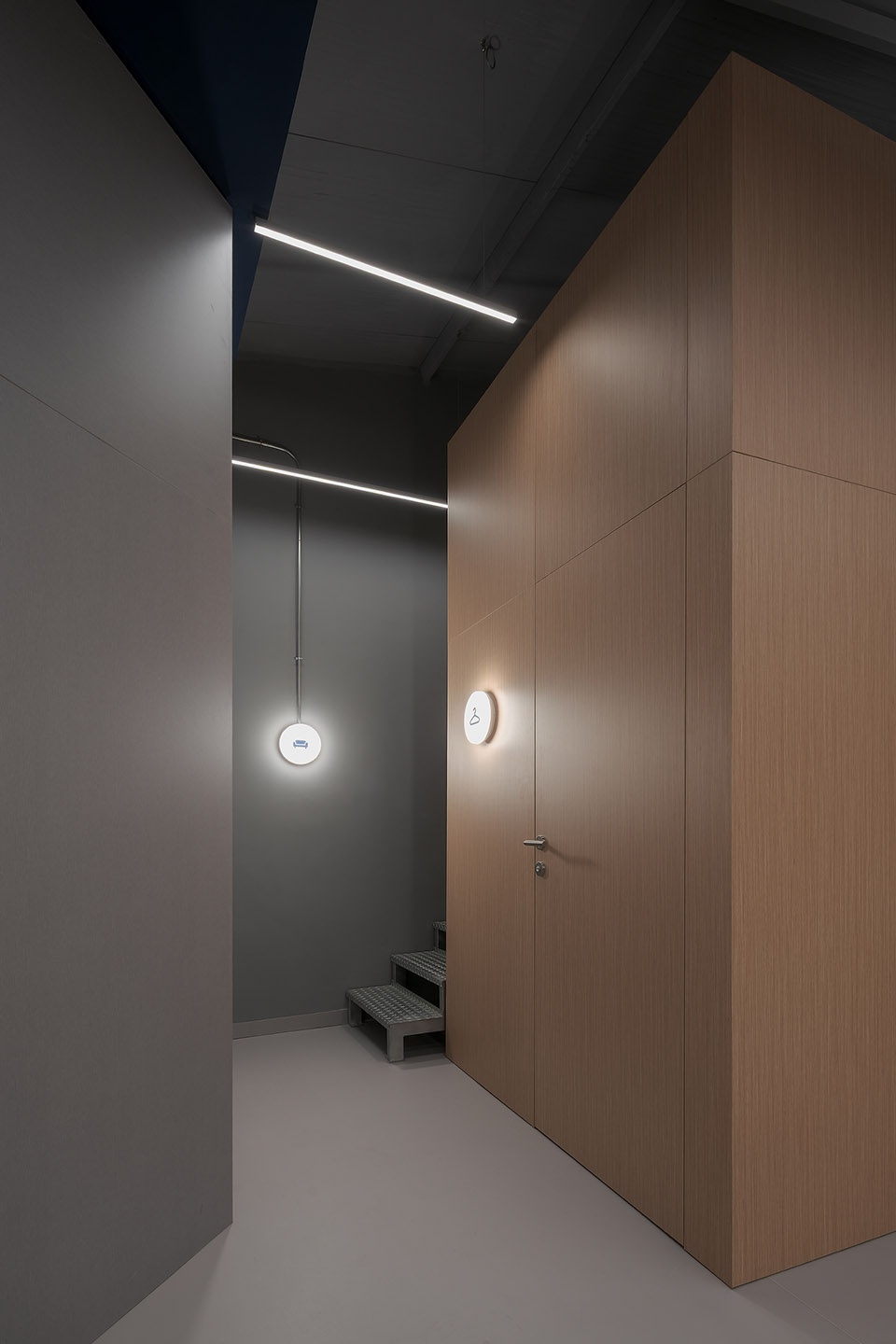 灰色表面与自然木饰面板的组合定义了沉稳而均衡的审美。深色天花强化了空间的纵深感,同时作为背景,使线性嵌入式光带更加突出。线性的精准光源组织了行进路径,并强化了体量的几何特征;与之形成对比的圆形光点,则提供了更亲近、更具人性尺度的光线。模块底部的漫射光营造出轻盈感,使构件仿佛轻浮于地面之上。