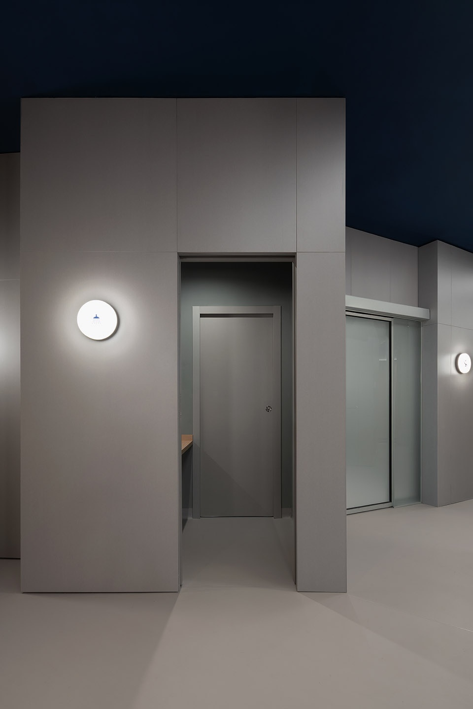 The combination of gray surfaces and natural wood panels defines a sober and balanced aesthetic. The dark ceiling emphasizes the depth of the space and acts as a backdrop that enhances the integrated lines of light. The lighting—linear and precise—organizes the path and accentuates the geometry of the volumes. In contrast, circular light points provide a closer and more human scale. The diffuse light at the base of the modules generates a sense of lightness, making the elements appear to float above the floor.