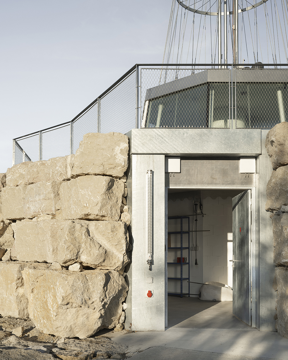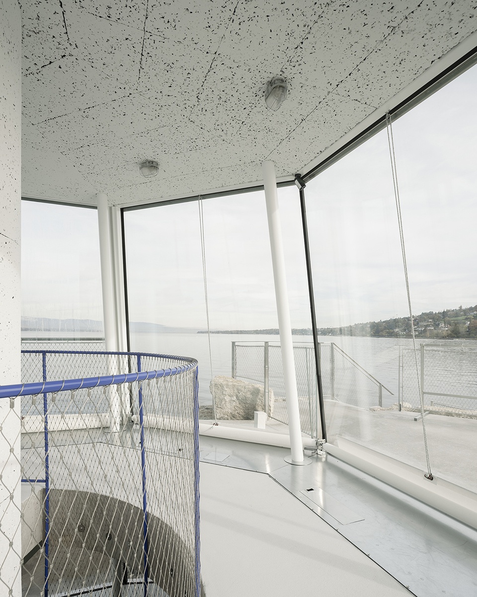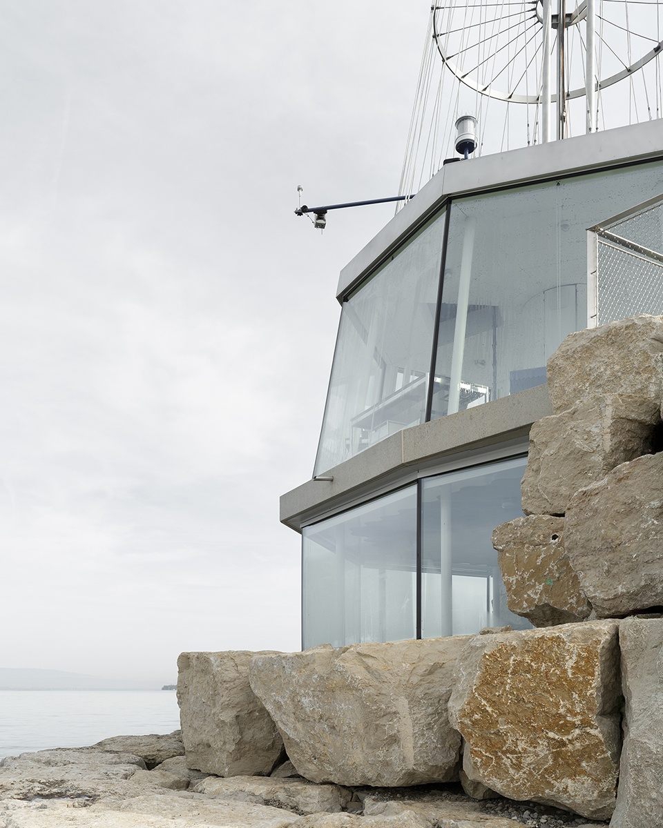 这种轻盈特质与日内瓦河岸的环境再契合不过——宛如海市蜃楼般,是由景观与透明性共同构成的建筑。在这里,灯塔不再是一个物体,而是一种结构,一件在天空中时隐时现、具备消散感的人工构筑物。与这种垂直的轻盈形成对比的是它稳固的矿物质基座——它确实是从岩石中“生长”出来的,是对港口常见的块石的一种改造与延续。