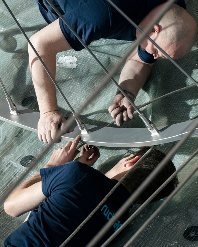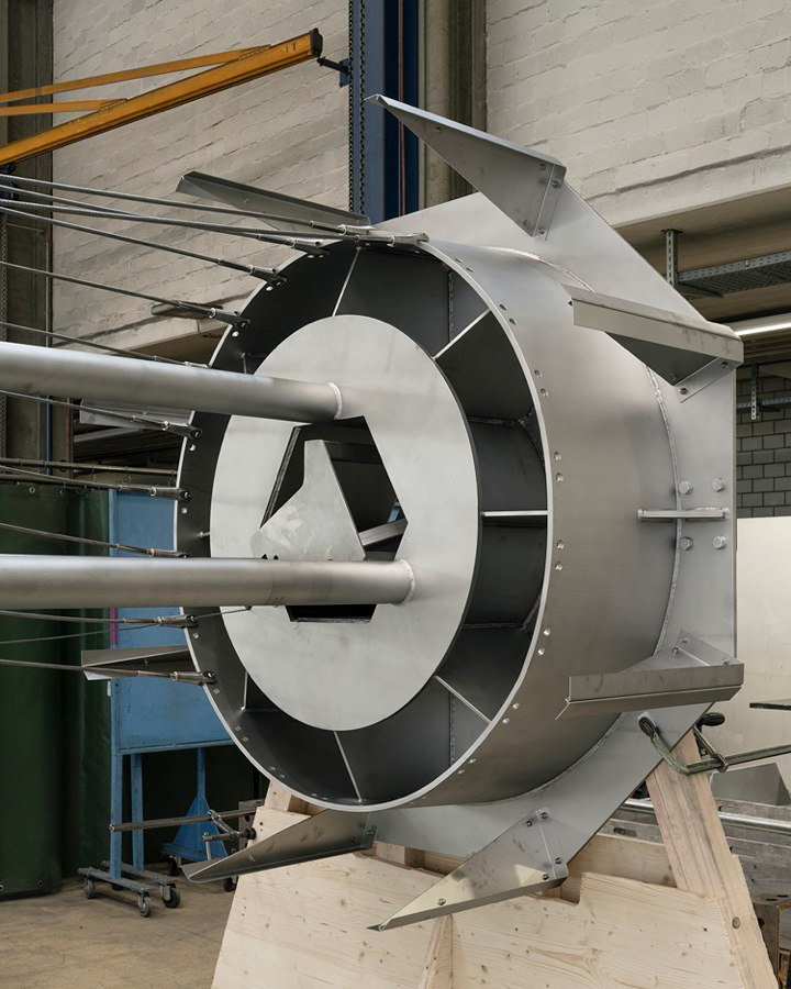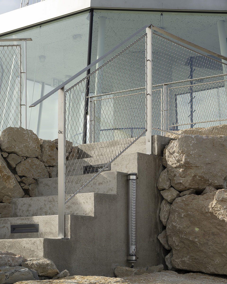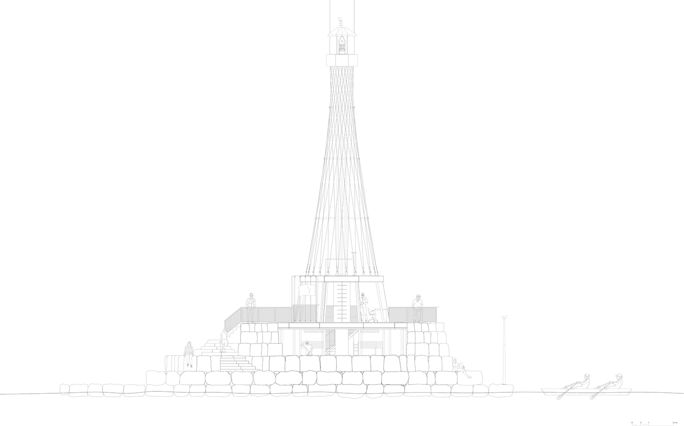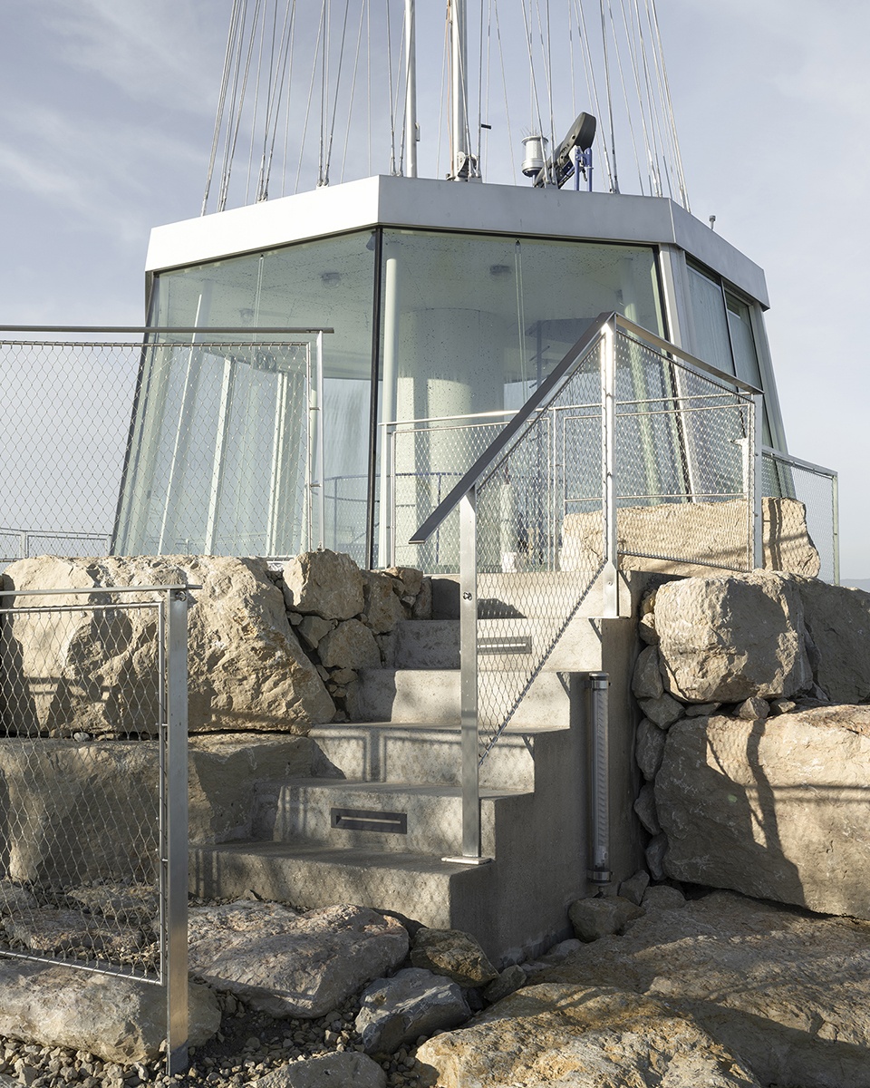 This lightness seemed perfectly suited to the context of Geneva waterfront. A mirage, an architecture made of landscape and transparency, where the lighthouse is not an object but a structure, an artefact that plays with its appearance and disappearance, its evanescence in the sky. In contrast to this vertical lightness, it stands on a solid, mineral, anchored base. It rises, literally, from a rocky base, a modified version of the mineral blocks found throughout the harbour.