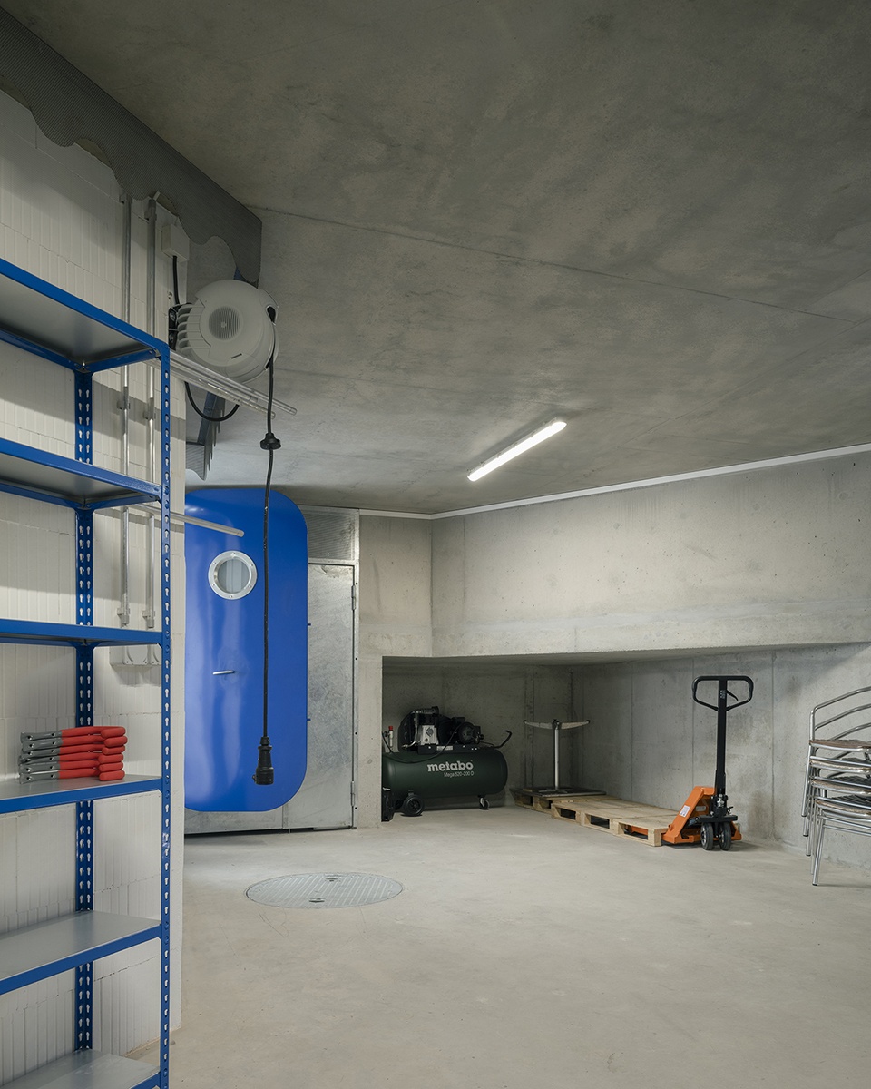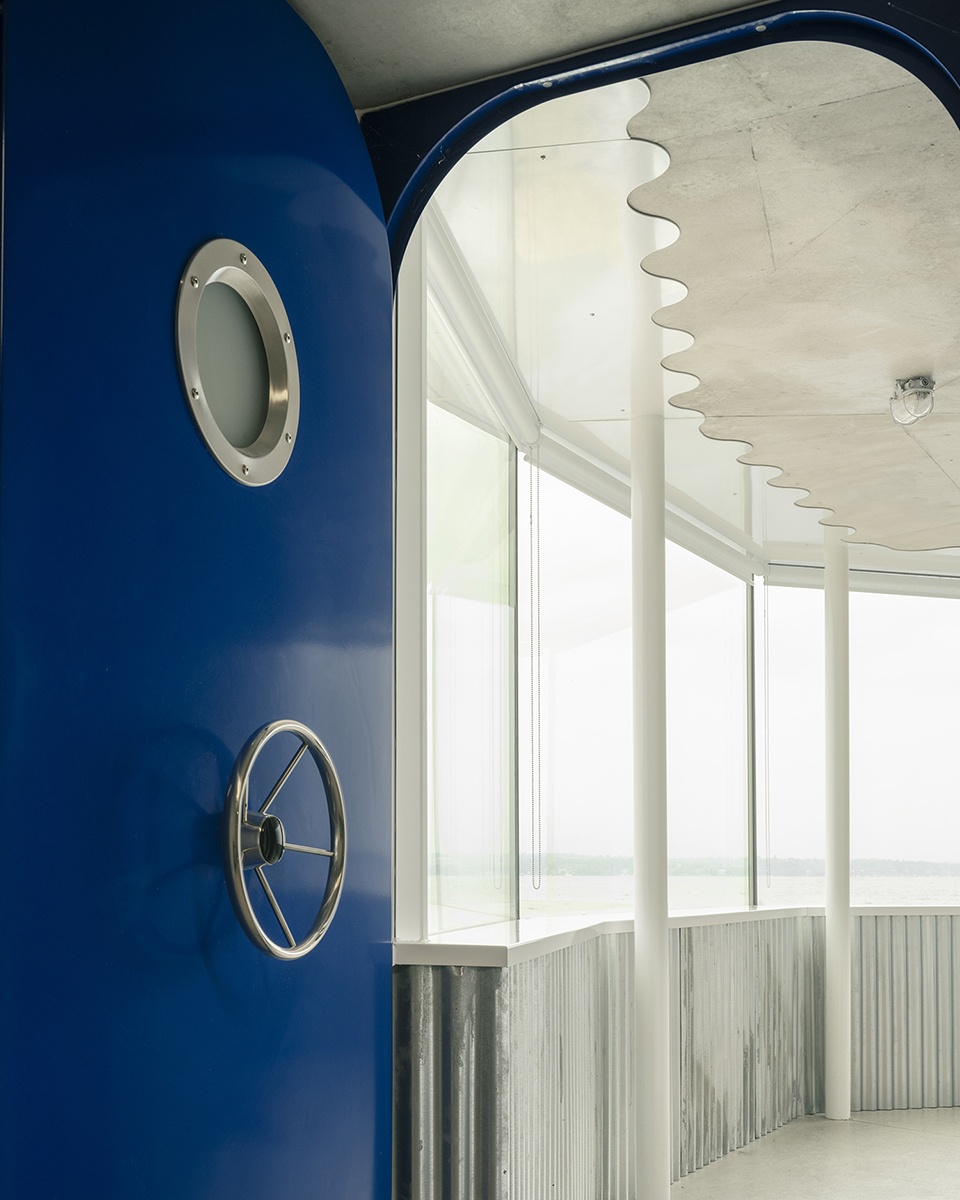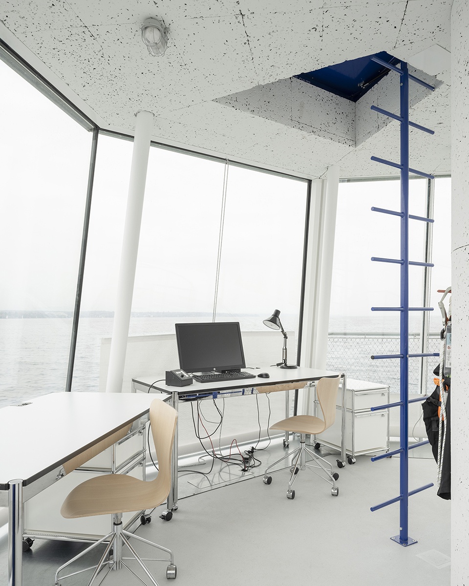 因此,这处场所的体验将是多层次且丰富的,包括建筑之外与建筑之内。项目的三层空间提供不同的感受:基座层作为生活空间,通过一扇长幅观景窗获得完整的全景视野,并形成安定的室内环境;这样的室内氛围令人联想到艺术家兼建筑师 César Manrique 在兰萨罗特岛上的神奇空间创作。上层舱室则以一种紧凑而高效的船舱式体验俯瞰湖面,提供完整的全景视角。项目的最终关键元素是一盏可动态升降的灯笼。灯具通过整合在灯塔柱体与结构中的导向系统实现升降。因此,灯塔不仅成为一种结构与景观的动态装置,也能与湖面、港口形成互动,无论远景、近景或更亲近的尺度。