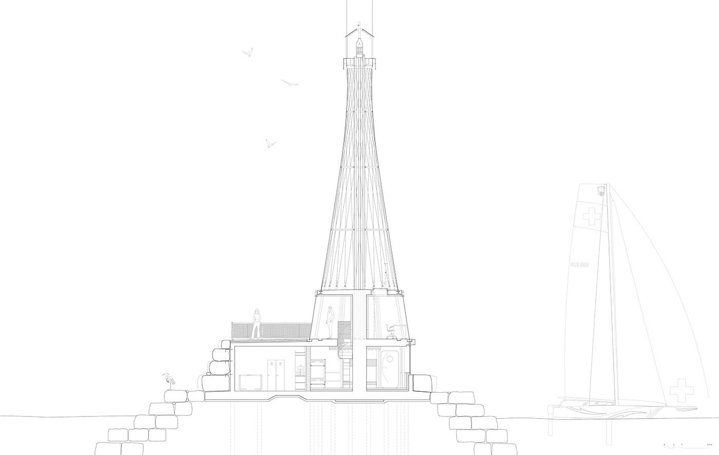 The context of the Geneva harbour may not offer the dramatic landscapes that we generally associate with this iconic silhouette. It is therefore in the calm of the Geneva Lake landscape that the Lighthouse will emphasise this undeniable beauty. The project thus deliberately confirms its vocation as infrastructure. In a way, it rejects the figurative, stereotypical and well-established architectural presence of the iconic lighthouse, replacing it with an infrastructural presence set against a landscape of riprap.