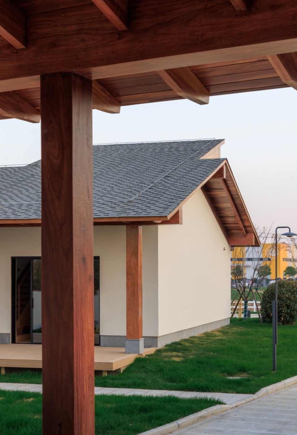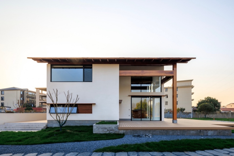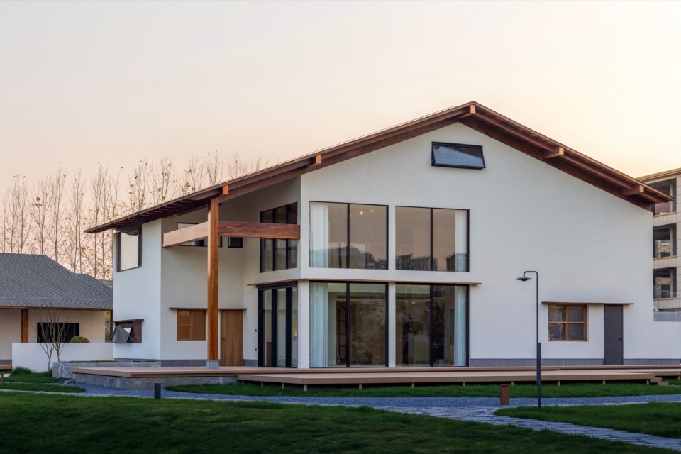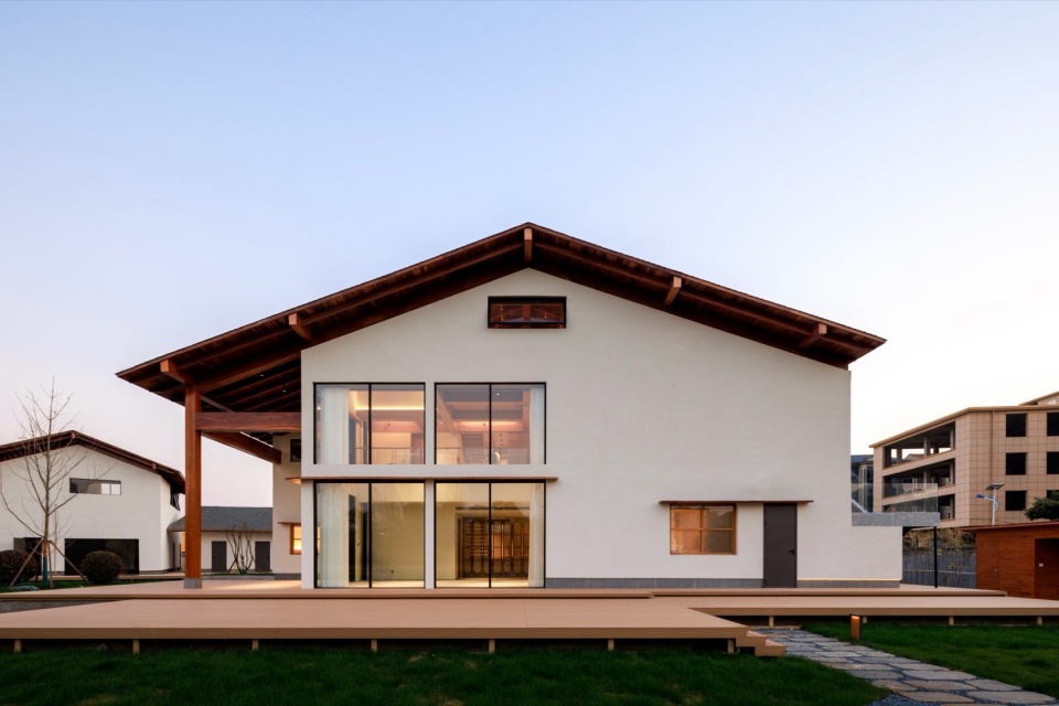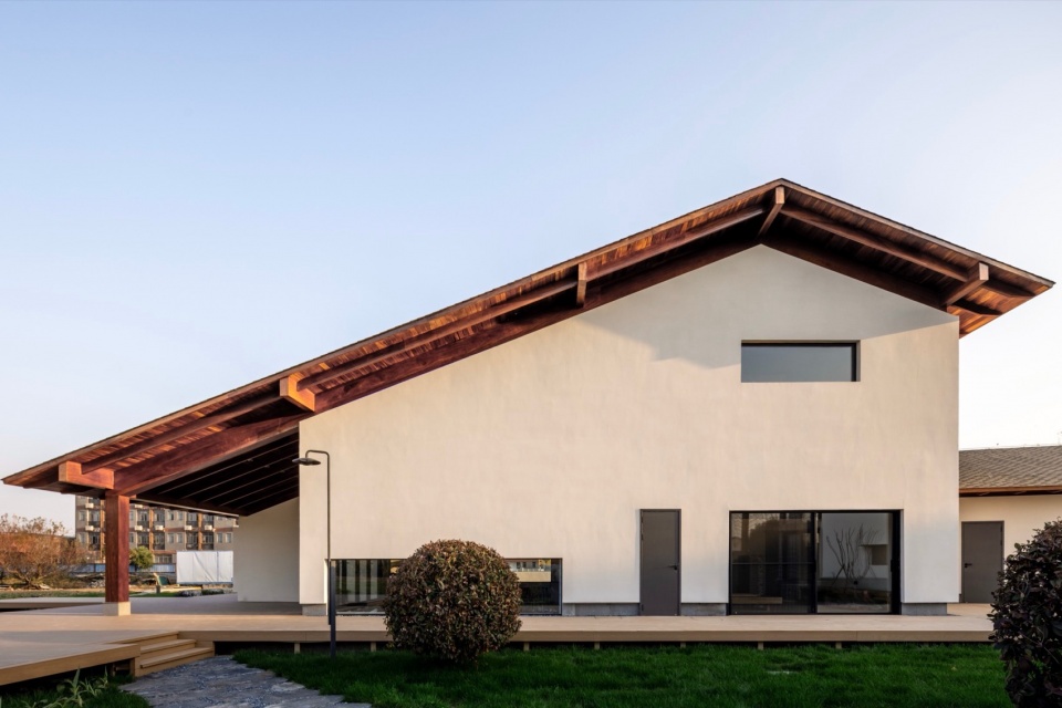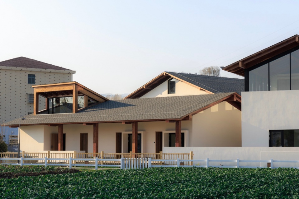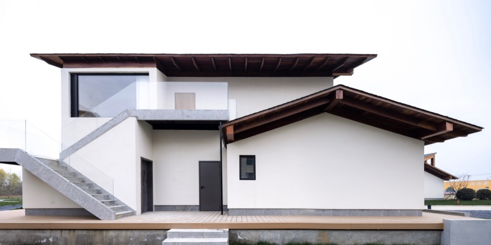 1号楼由东西坡向的三层主体与南北坡向的一层廊亭结合组成。围绕主体建筑设置围廊,这在东西方建筑中都很常见:中国古建筑中的檐廊,日本住宅建筑的缘侧空间(Engawa),西方古典建筑尤其是意大利文艺复兴时期别墅 (Villa)中的凉廊(Loggia)。无论哪种类型都出于同种思考:建立内与外之间的感官认知缓冲带,制造“庇护中的开放”。风、光、声可自由进入,而雨不能,以便形成一个由田野到居住的过渡融合。我们将檐廊部分被化用室内空间,以避免形式上过于贴近某一特定风格。