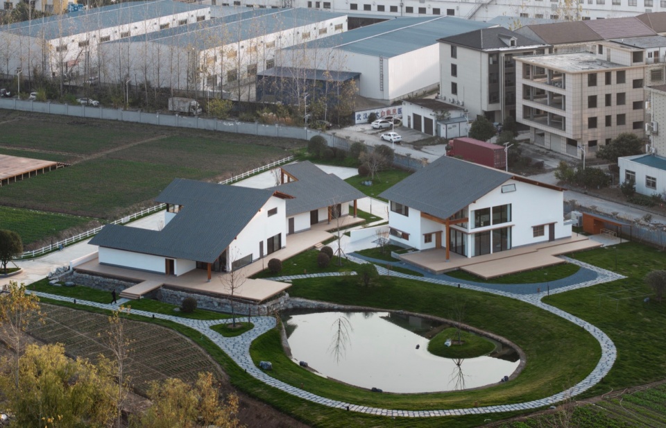 距馥园住宅的场地不足2公里就是一片新近规划的社区,已经耸立了不少新商品房。这是一块被芝麻田环绕的宅基地,中央有一处低洼地,雨季时常积水。业主希望在满足日常居住功能的同时,也能容纳亲友聚会,并营造一种“田隐”的氛围——如“开轩面场圃”般,既融入田野,又保持内敛。一侧是工厂与新兴社区带来的喧扰与节奏变化,另一侧是农田无边开敞所带来的空旷,如何在田野生活与现代人居之间取得平衡,成为我们设计思考的核心焦点。