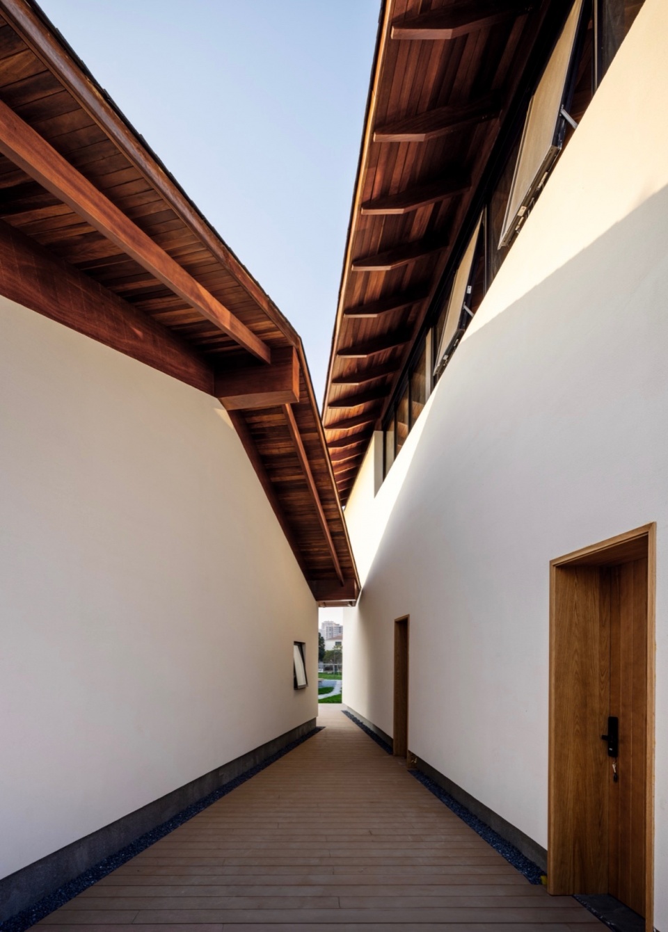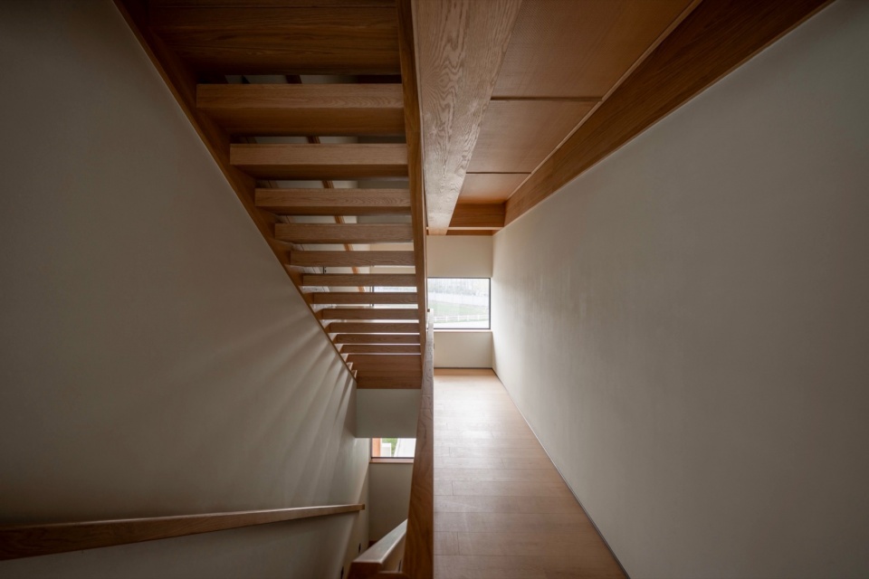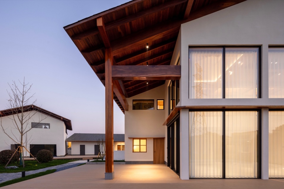 Building 1 combines a three-storey main volume oriented along the east–west slope with a single-storey pavilion aligned north–south. Encircling the main block is a perimeter gallery—a spatial device deeply rooted in both Eastern and Western traditions: the yanlang (eaves gallery) in classical Chinese architecture, the engawa (veranda) in Japanese houses, and the loggia in Western classical design, particularly in Italian Renaissance villas.Though culturally distinct, all these forms share a common intention: to establish a sensory threshold between interior and exterior—what might be called “sheltered openness.” Here, wind, light, and sound flow freely, while rain is kept at bay, creating a gentle transition from the open fields into domestic space.In our interpretation, the eaves gallery is absorbed into the interior realm, not as a literal stylistic quotation, but as a reimagined spatial condition—deliberately avoiding overt reference to any single tradition.