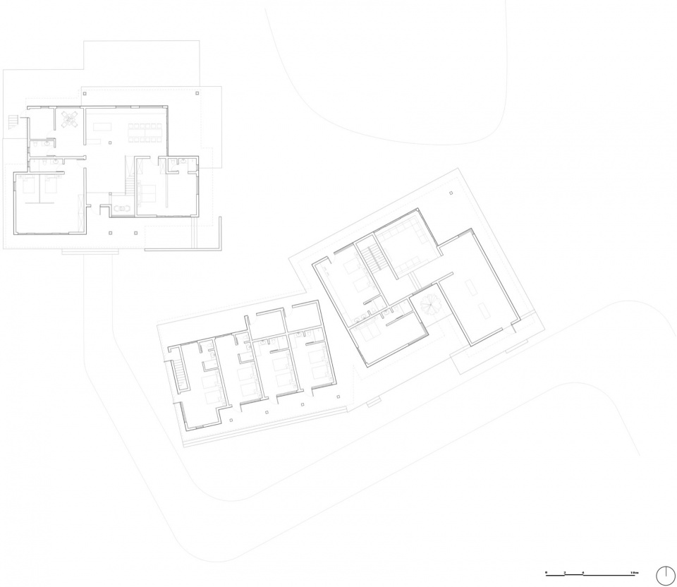 住宅聚落由三个居住单元组成,呈U形环绕场地中央由洼地形成的椭圆形水体布局。建筑体量以不规则、相互咬合的几何方式组合,并依托两个独立的基台,与水体共同围合出一个内向的庭院。整体布局顺应场地的自然肌理,尤其是水系的蜿蜒形态,呈现出一种“拥抱”景观的姿态。