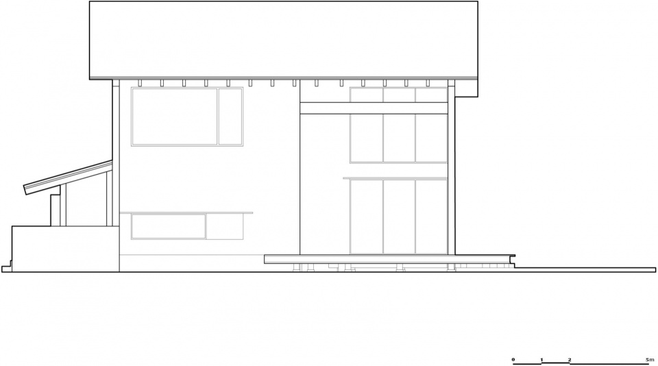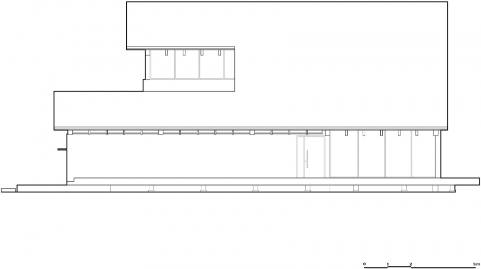 Building 2 is aligned along the east–west road, deliberately elongated to extend the experience of viewing it from the outside. It is a single-story structure, flanked and sheltered at both ends by Buildings 1 and 3, and enclosed by an outer courtyard. Its low-slung volume hugs the ground, allowing Building 1 behind it to peek subtly above its roofline.