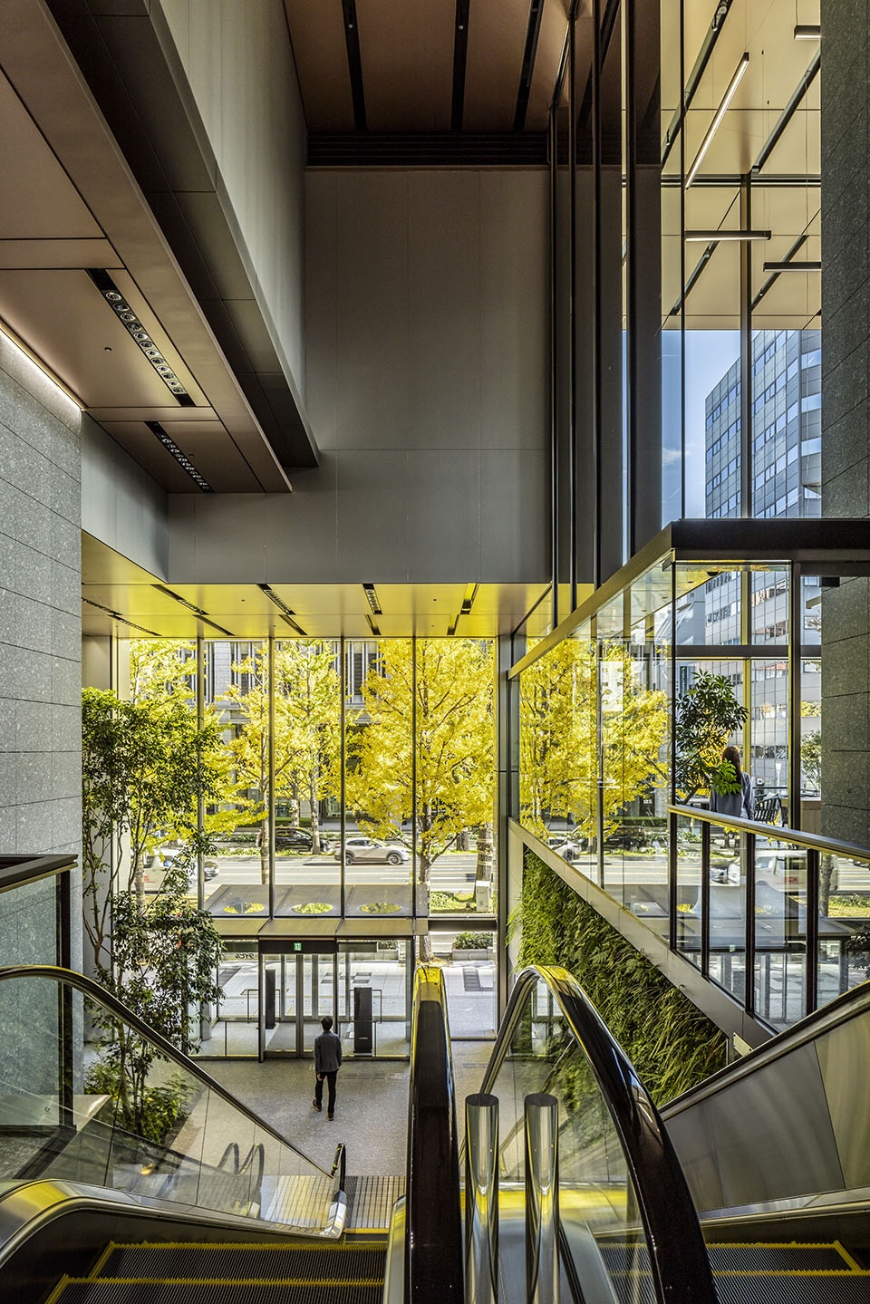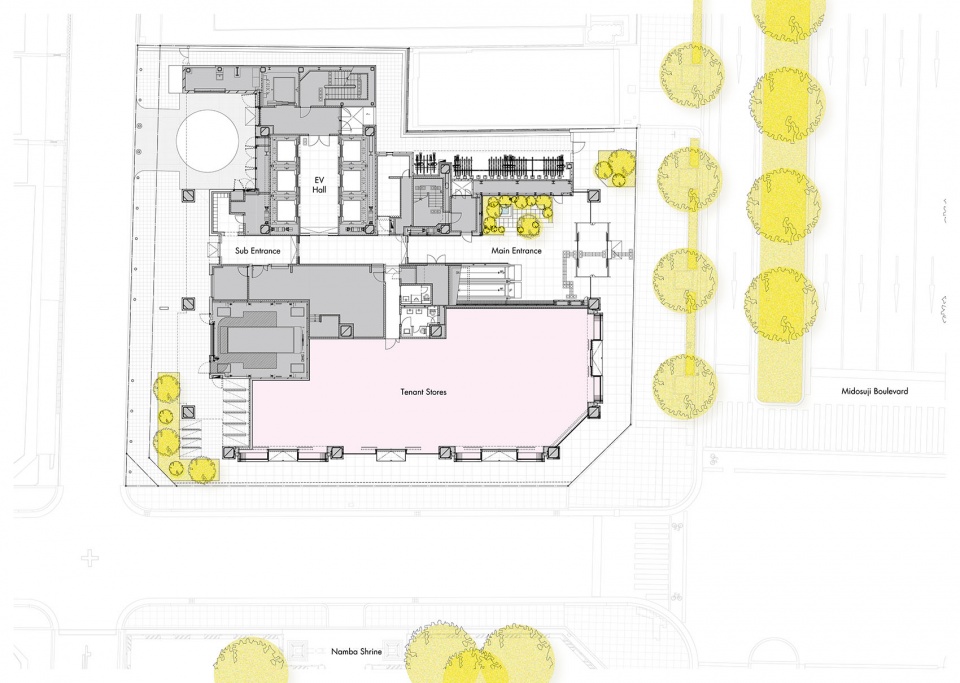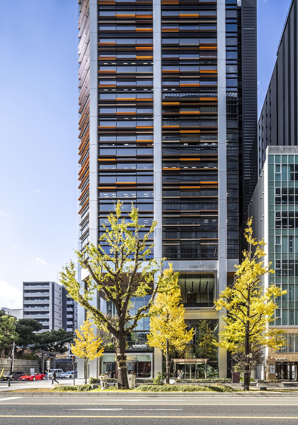 Positioned along the axis of a venerable shrine, the building’s framework gains legitimacy through vertical pillars gleaming in a slate gray tone inspired by onbashira pillar forms, considered among the “roots” of Japanese architecture. This harmonizes old and new within the collective forms of the neighborhood, linking the shrine and the office building complex. The subtle, variegated tones of the solar control fins resonate with the ginkgo trees lining Midosuji, adding color to the cityscape.