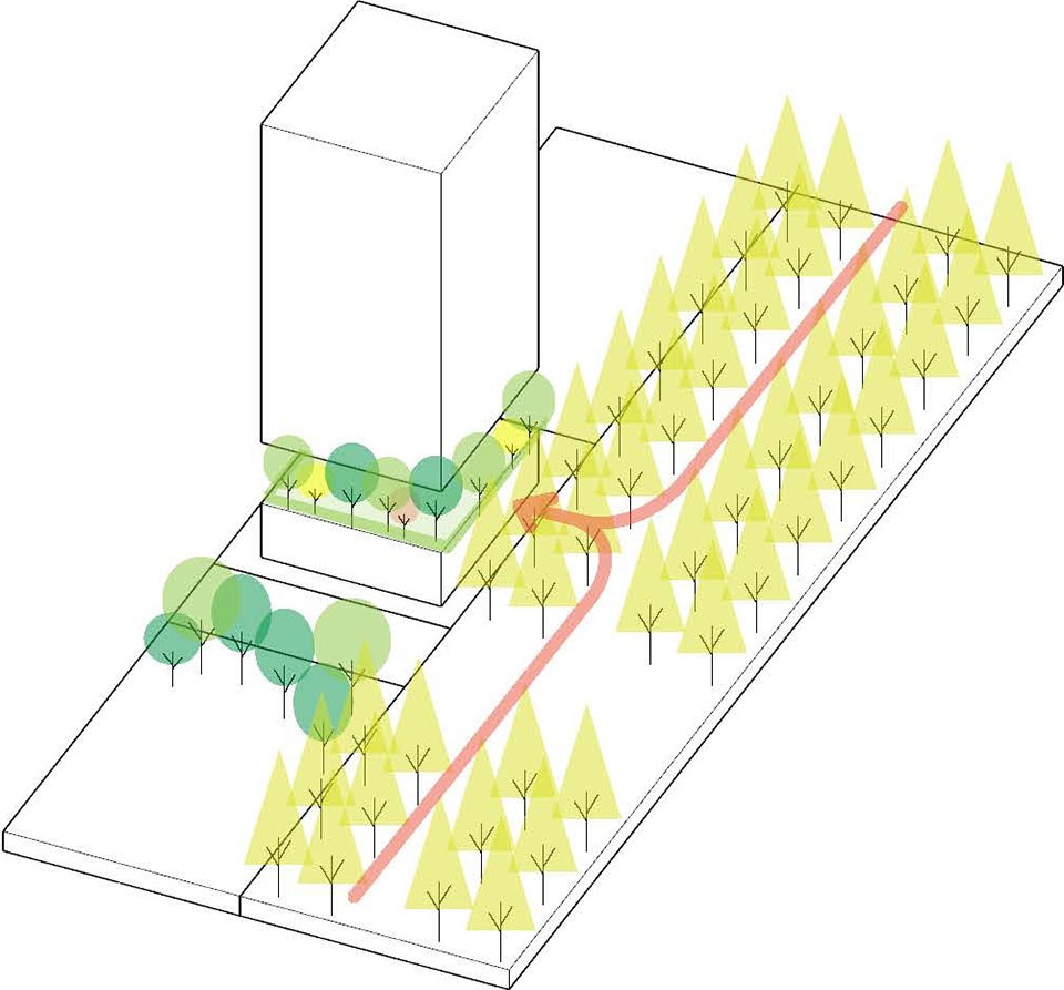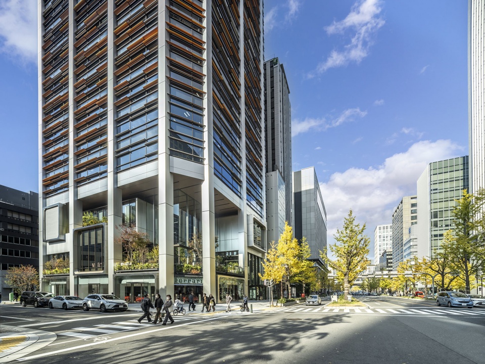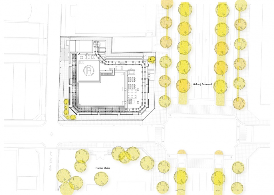 This tenant office building faces Midosuji Boulevard, the main thoroughfare in Osaka, Japan’s second-largest city. Located within a uniquely dense urban environment, the design leverages the site’s conditions facing Midosuji’s beautiful ginkgo tree-lined avenue and the greenery of a nearby shrine. An exterior design was derived via simulation, using the presence/absence of views of greenery and sky as parameters for the optimal placement of exterior solar fins, in a novel approach to Japanese tower design. Terraces overlooking Midosuji were created on the lower floors, establishing the concept of a multi-layered plaza within a high-density city.
