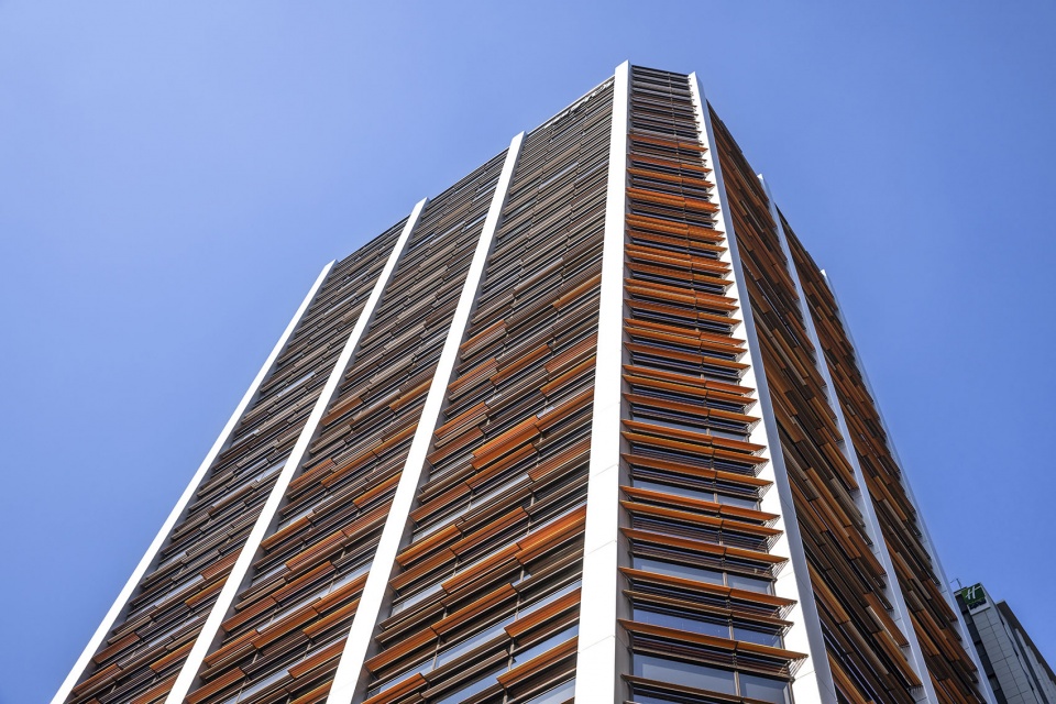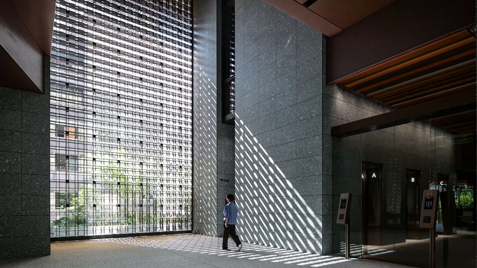 地块位于历史悠久的神社轴线上,由此从堪称日本建筑根源的“御柱”中获得灵感,采用泛着深灰色光泽的垂直柱体,赋予建筑骨架正统性,并在连接神社与办公楼群的区域群造型中实现了新旧和谐。遮阳鳍片带有斑驳变化的细腻色调,与御堂筋两旁的银杏树相映成趣,为街景增添了色彩。