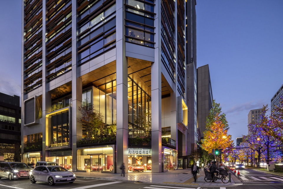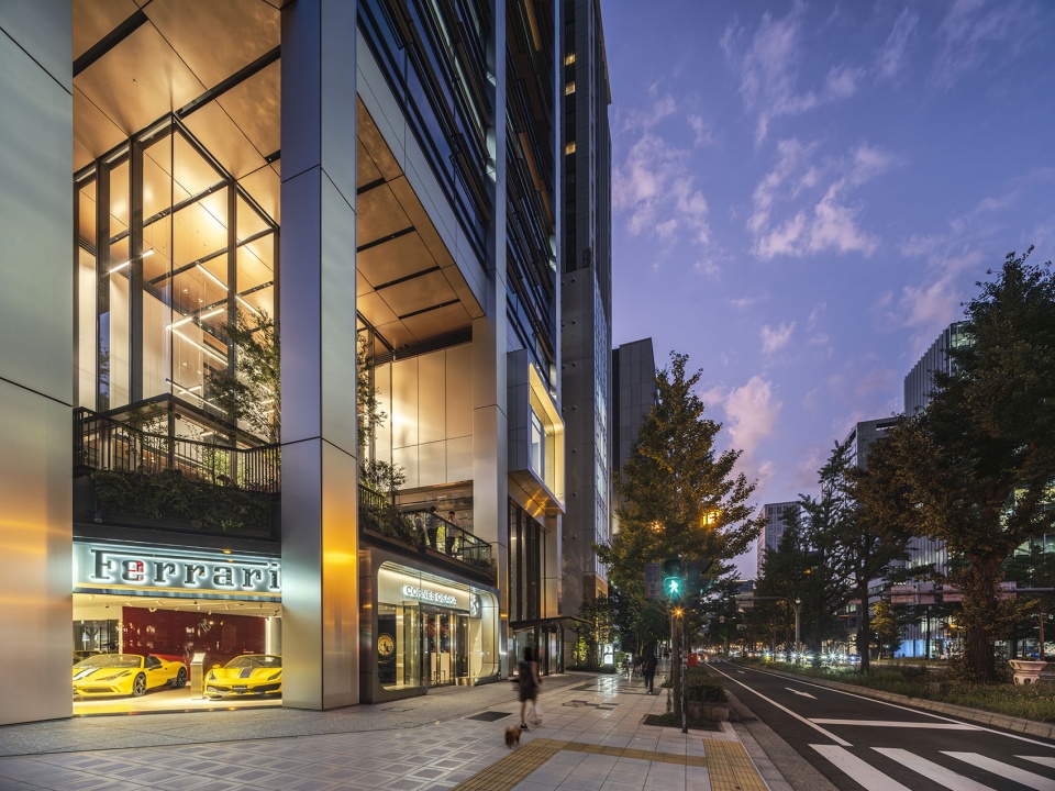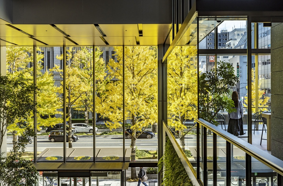 这是一座在日本第二大城市大阪的主干道御堂筋上临街而立的租赁式办公楼,大楼虽身处日本特有的高密度城市环境中,却毗邻两旁种满美丽银杏树的御堂筋与绿意盎然的神社。设计团队充分利用这一场地条件,将能否看到绿植和天空作为参数,通过模拟来优化外部遮阳鳍片的布置,从而构思出外装设计,为日本的塔楼设计提出了新的方案。同时,低楼层设有俯瞰御堂筋的露台,在高密度城市中创造出立体广场的概念。