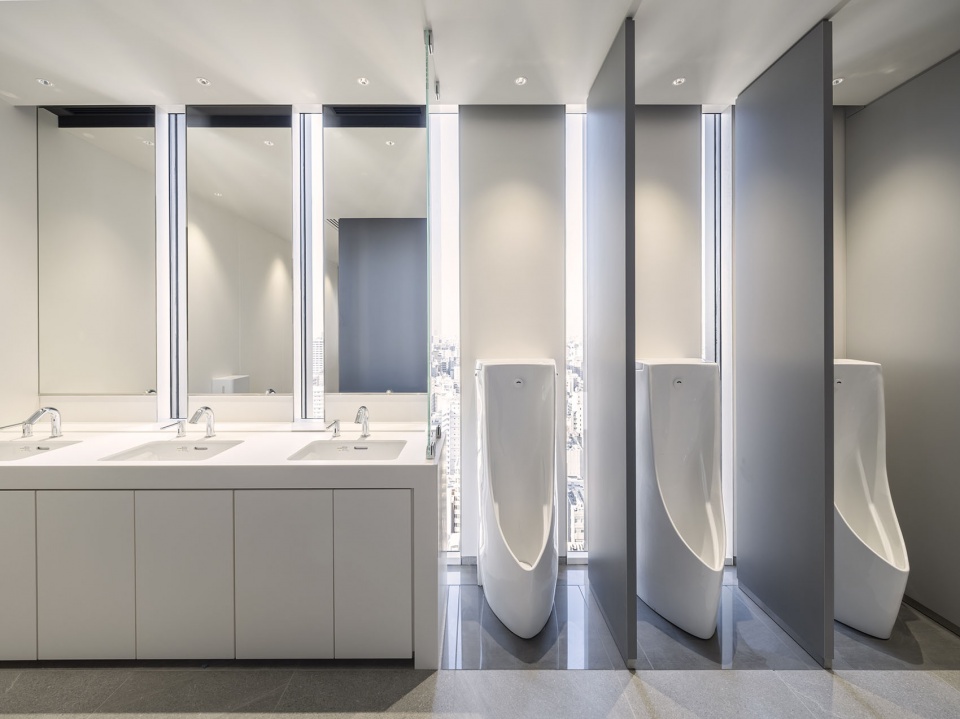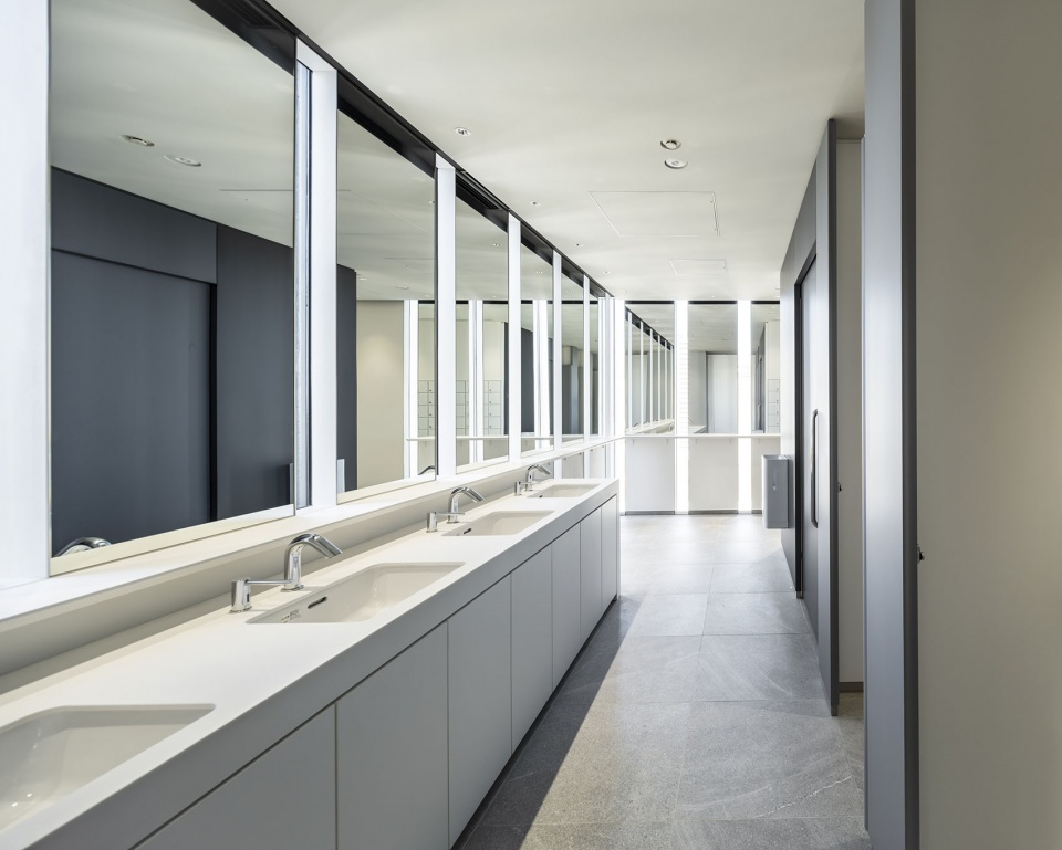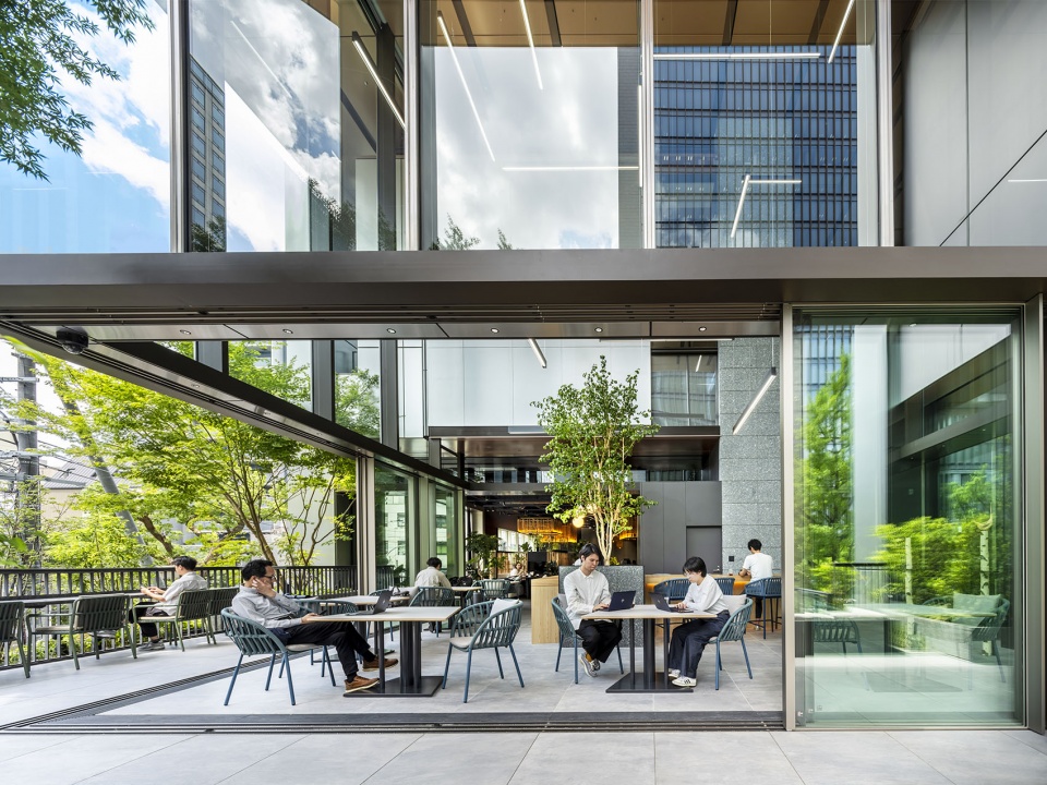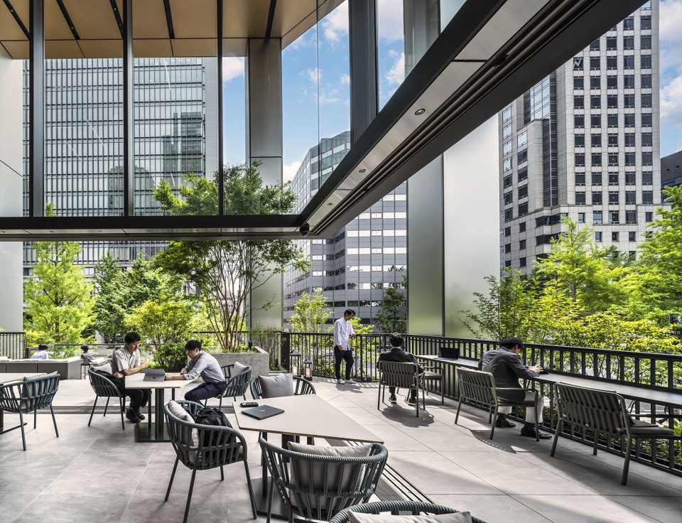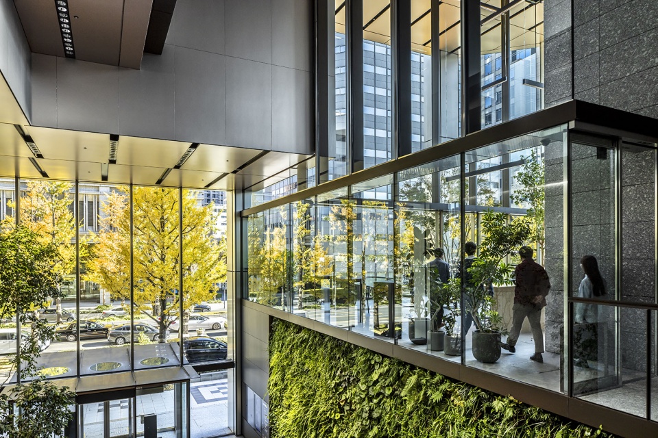 通过采用带有散水装置的高效热源、显热潜热分离空调、新风制冷空调、自然通风及二氧化碳控制等技术,与同等规模的基准建筑(Baseline Building)相比,成功削减了40%以上的能源消耗,并获得了日本环境性能最高等级的认证。建筑采用了内置于幕墙的通风单元与公共区域通风窗联动自动开关的自然通风系统。另一方面,照明和温度方面引进了利用终端的能动控制系统,使用户能够直观地自主调节环境。