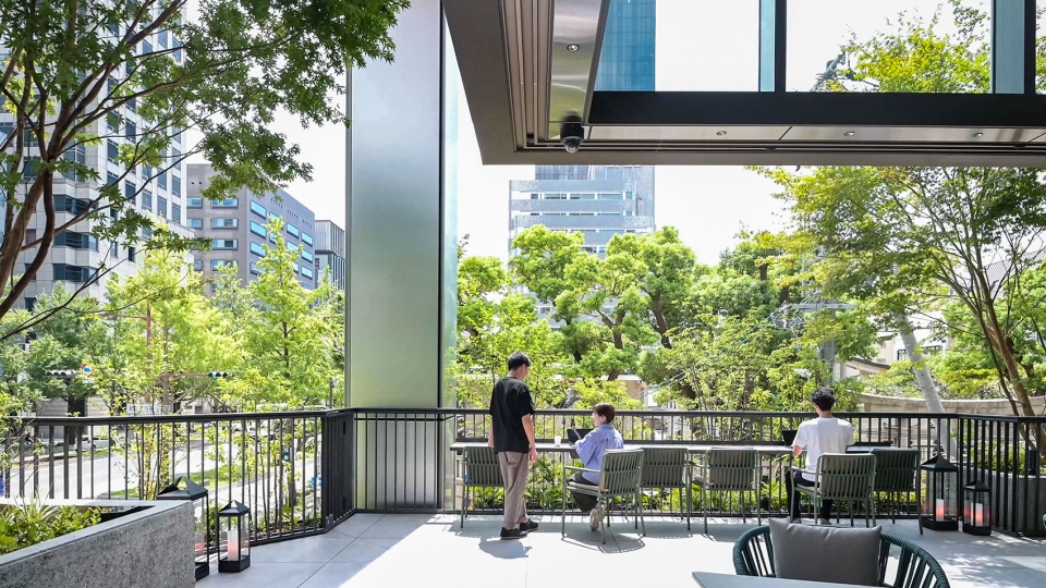 The high-value commercial first floor is designed as a large show window, with prominent storefronts that face the street. Above this, a large recess was created between the ground level and the 18 meter-high office volume, forming a lush outdoor terrace. This terrace serves as a viewing platform overlooking Midosuji Boulevard, where parades and festive events occur. It also creates a sense of expansive space and greenery for pedestrians looking up from the street, establishing a new “multi-layered plaza” concept that connects the city and the building.