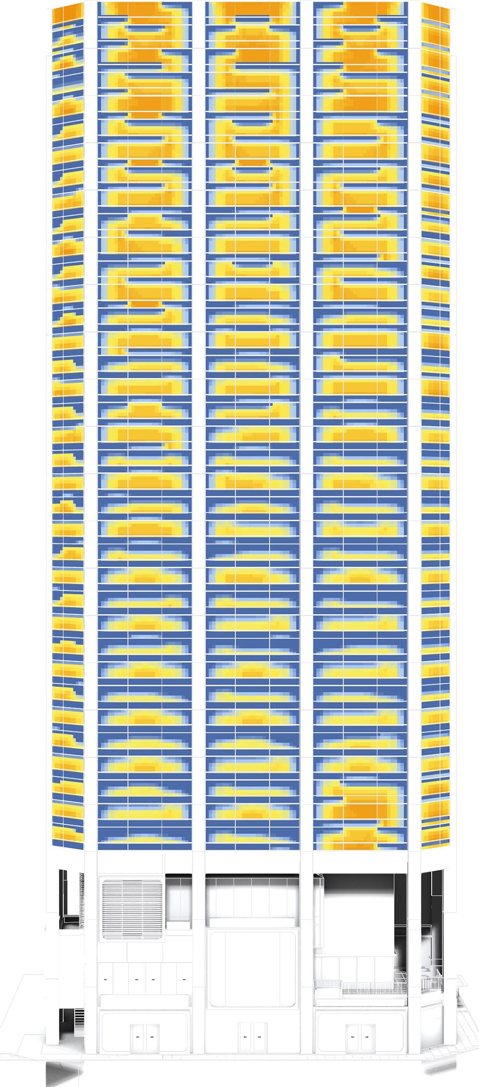 在当下的办公楼中,抑制环境负荷与追求节能性已成为理所当然的要求,同时我们认为,满足人类对“眺望景观”的根本性需求对办公室职员而言同样至关重要。将看到“天空”以及御堂筋和神社“绿意”的视野定义为积极元素,并将从办公室内眺望这些景观的视野程度可视化为“景观潜力 (View Potential)”。 通过用鳍片总量规定建筑应满足的遮阳性能,再运用计算设计技术将其与“景观潜力”进行对照并实现最优配置。此外,不仅考虑日照负荷,还通过对包含周边温度和内部发热在内的“综合环境负荷”进行逐小时的精细模拟,最大限度提升了工作人员的舒适度。