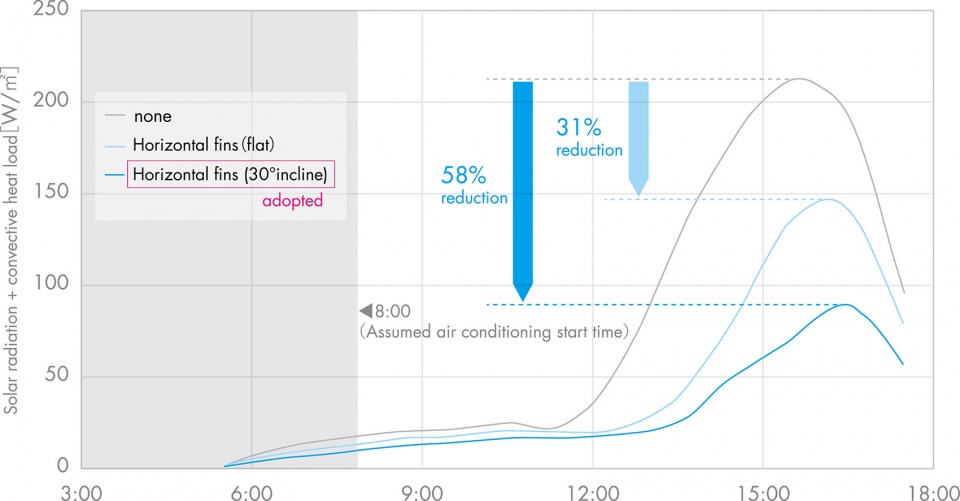 While environmental impact reduction and energy efficiency are now standard requirements for modern office buildings, we considered fulfilling the fundamental human desire for “views” to be crucial for office workers. We defined views of the sky and the greenery of Midosuji and the shrine as positive elements, quantifying their extent from within the office as “view potential.” We specified the required solar shading performance of the building in terms of total fin volume. Using computational design, we optimized the placement of these fins by comparing them against view potential. Detailed simulations assessed not only solar radiation load but also “total environmental load” which encompasses surrounding temperatures and internal heat generation, in order to maximize worker comfort.