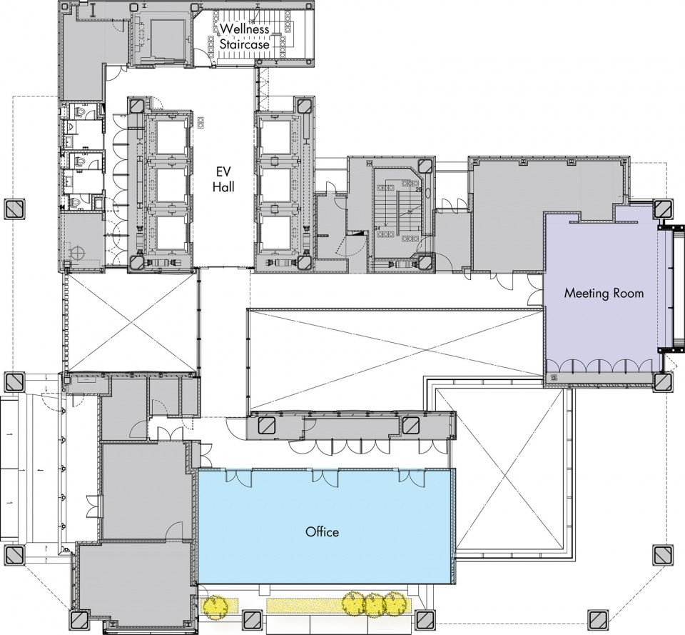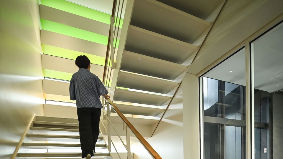 从1层入口到2层门厅,再到户外露台,建筑通过以本土植物为主的绿植与水景,不断将御堂筋的绿意引入室内空间。迎接来客的是亲生命性的环境,进入上层的办公空间后,外装鳍片在光照下以细腻色调闪耀生辉,为空间增添了色彩。通常处于阴暗隐蔽处的疏散楼梯与电梯厅相邻,以此积极引入自然光,同时通过窗边的色彩变化与透过树叶洒落的斑驳光影,打造出令人想要漫步的“Wellness楼梯”,旨在提升使用者的健康水平。