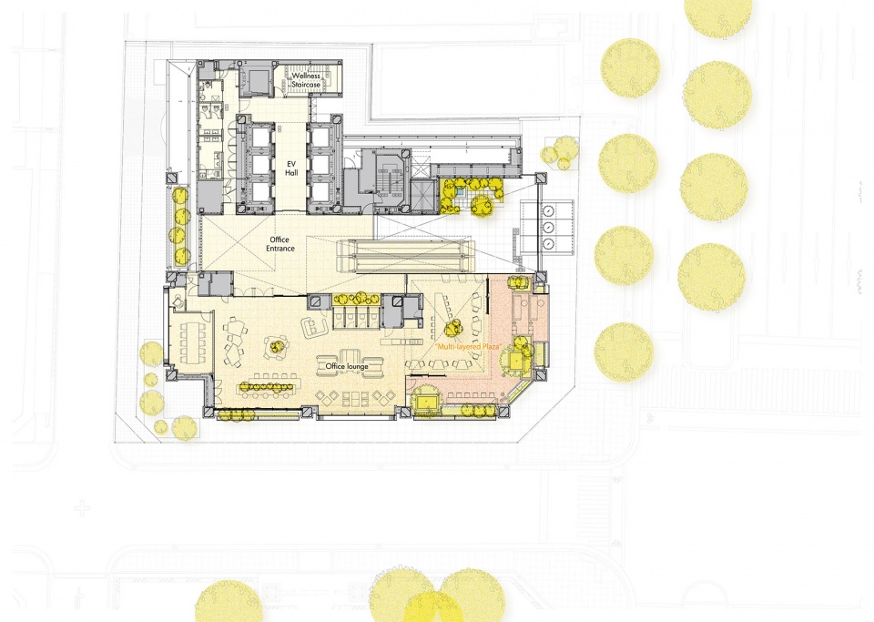 根据大阪市《御堂筋未来愿景》,御堂筋正在通过将车道全面人行道化来推进步行友好城市的建设。在此背景下,设计团队探讨了高密度城市中以“人”为核心的办公楼的理想形态。