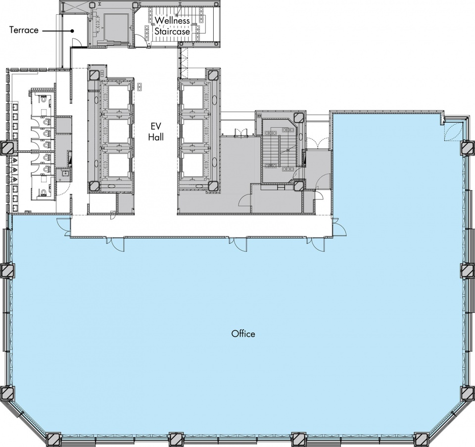 From the first-floor entrance through the second-floor lobby to the outdoor terrace, native plants and water features draw Midosuji greenery continuously into the building. Users are welcomed into a biophilic environment. Upon entering the upper office spaces, the exterior fins, shimmering with delicate hues as they catch the light, add color. The evacuation staircase, typically relegated to the rear, was positioned adjacent to the elevator hall to actively incorporate natural light. Through the changing colors around the windows and dappled sunlight, this “Wellness Staircase” entices walking, contributing to user well-being.
