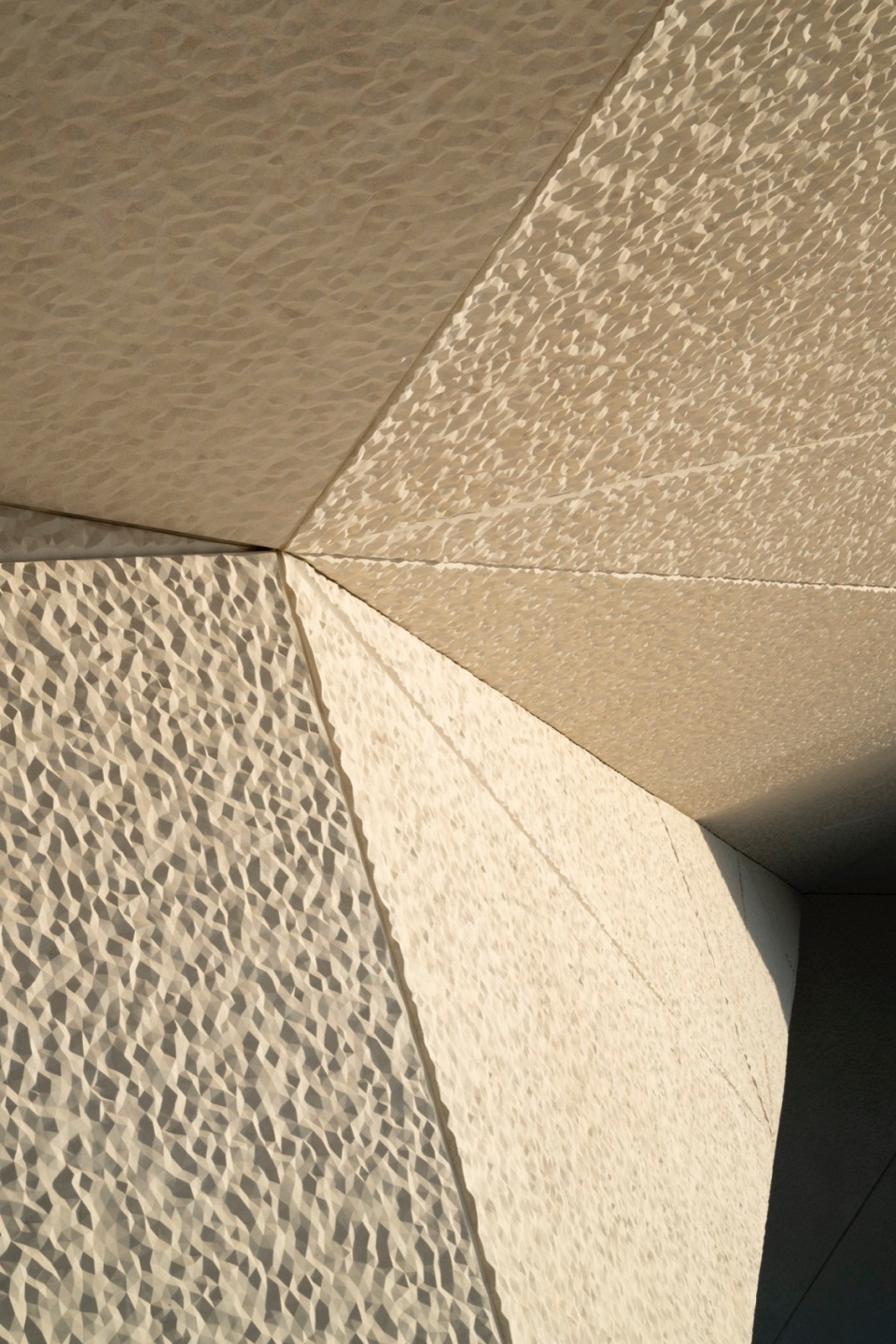 The museum spaces are located within a mound, which has textured faceted panels that are an abstraction of the UAE’s topography. The mound insulates the interior spaces from solar gain, forming a protective shield that prevents heat from entering the building. When visitors step inside the museum, they enter the light-filled atrium, or Al Liwan, which serves as both a meeting and orientation space, hosting performances such as traditional dance and poetry.