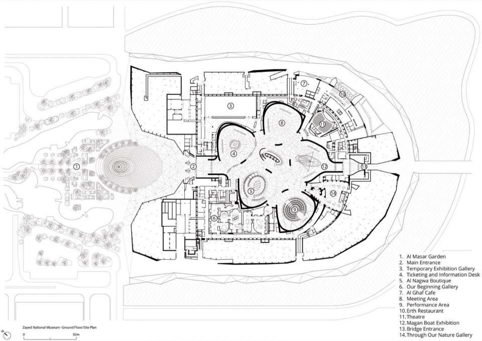 在博物馆建筑外围,谢赫·扎耶德对自然的热爱体现在阿尔马萨尔花园(Al Masar Garden)中,它将建筑与海岸连接起来。花园融合景观与文化遗产,被设计为新的社区资源,提供社交、玩乐与静思的场所。访客也可沿着遮荫步道,从地面走至土丘顶部、翼塔基座处的观景平台,在此欣赏周边区域的全景景观。