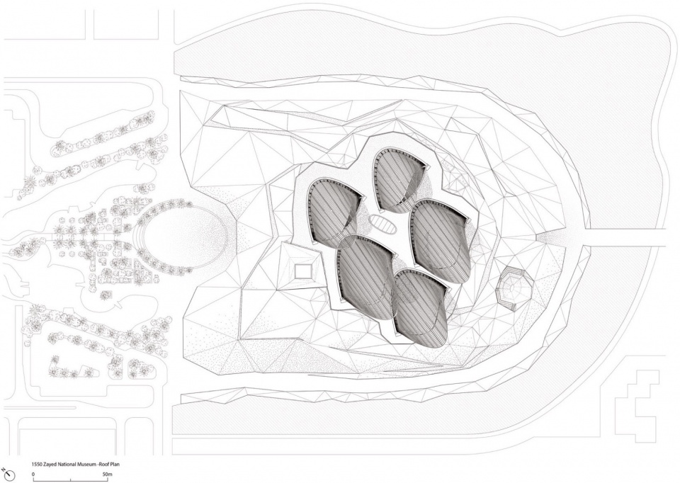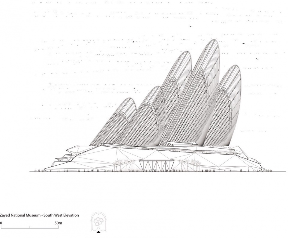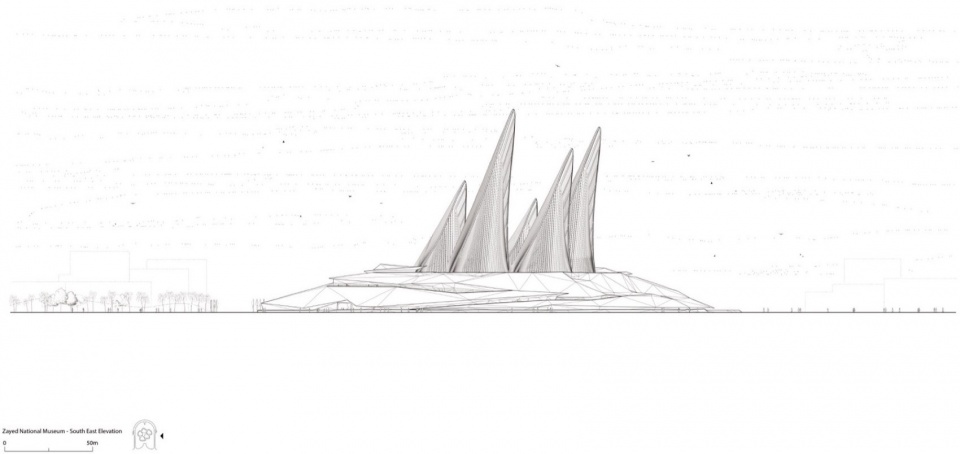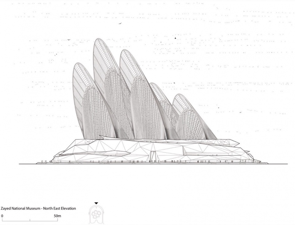 Foster + Partners 创始人兼执行主席诺曼·福斯特表示:“扎耶德国家博物馆讲述了谢赫·扎耶德创建阿联酋的故事,以及他遗产的多重面向,包括其让沙漠变绿的愿景。建筑本身表达了可持续理念,五个流线型翼塔构成环境系统的重要部分,作为热烟囱,将凉爽空气引入公共空间。它们也象征着谢赫·扎耶德对传统猎鹰运动的热爱,并成为城市天际线的标志。”
