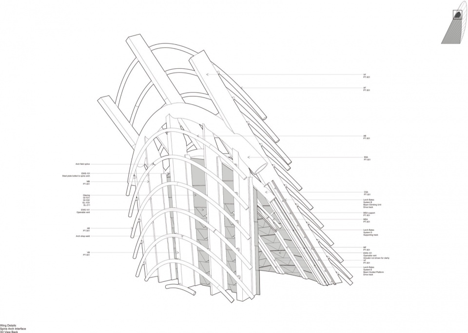 博物馆的五个轻质钢结构翼塔是自然通风系统的一部分。塔顶的通风口开启后,利用翼塔背风侧产生的负压,将中庭中的热空气抽离;翼尖的热量积聚所产生的热效应进一步增强排热效果。从沙漠深层地底埋设的管道中自然冷却的空气随后通过低位通风系统进入中庭。翼塔采用玻璃幕墙,将自然光引入下方展厅,并且每个翼塔都可独立调节。