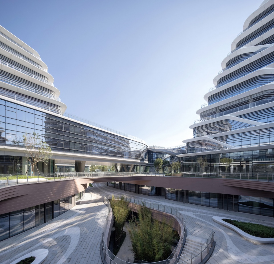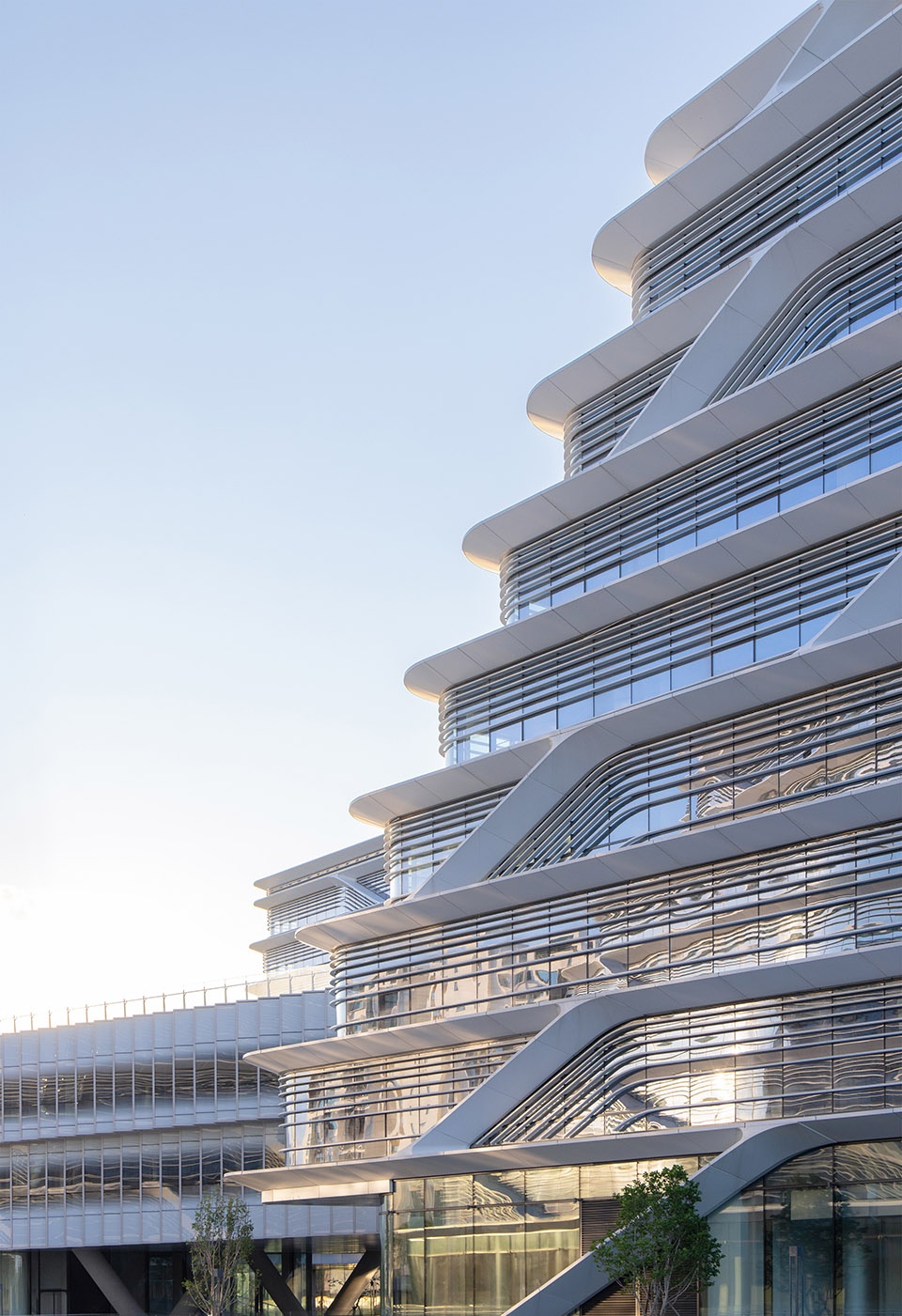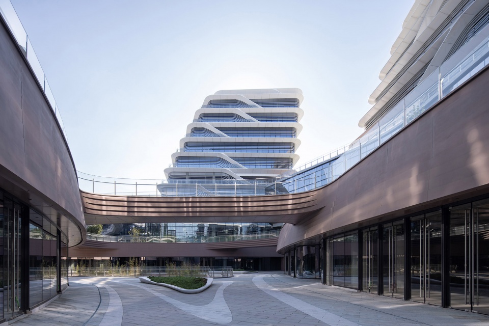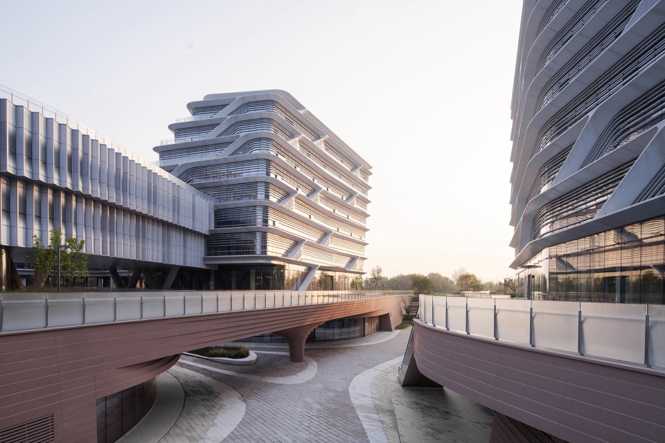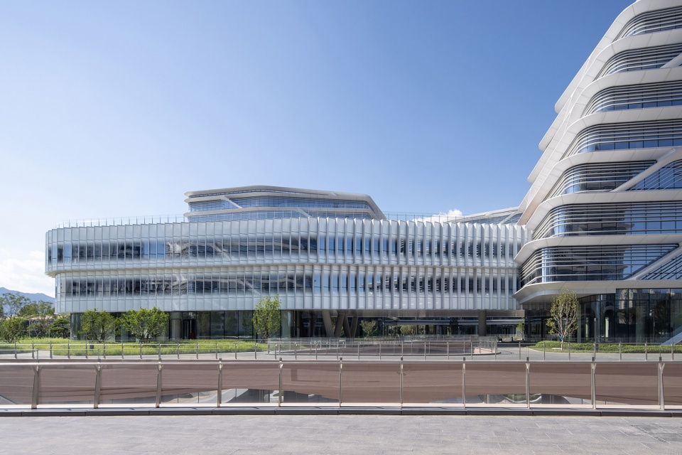 主体建筑的幕墙设计延续了东方山水的理念,以中国传统山水画《富春山居图》为灵感,将画中山水的层峦叠嶂与写意皴法,抽象转译为西、北、东三个地块“山、水、云”融合的建筑立面,同时各具特征和细部。 又通过数字化和绿色节能技术的运用,营造出各个组团的轻盈和通透感。