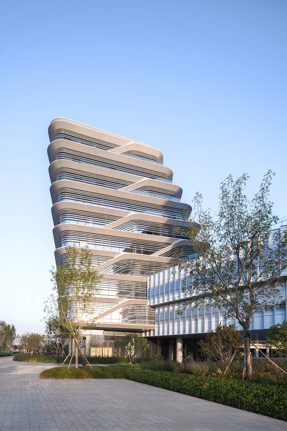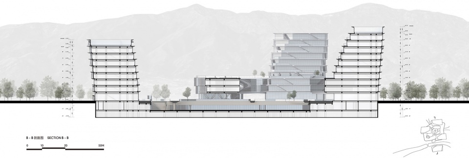 The facade design of the main building continues the concept of Oriental landscape. Inspired by the traditional Chinese landscape painting Dwelling in the Fuchun Mountains, it abstractly translates the overlapping mountains and freehand brushwork into a building facade that integrates mountains, water, and clouds. Additionally, the twisting forms of each tower generate rich rhythmic variations in the facade design.