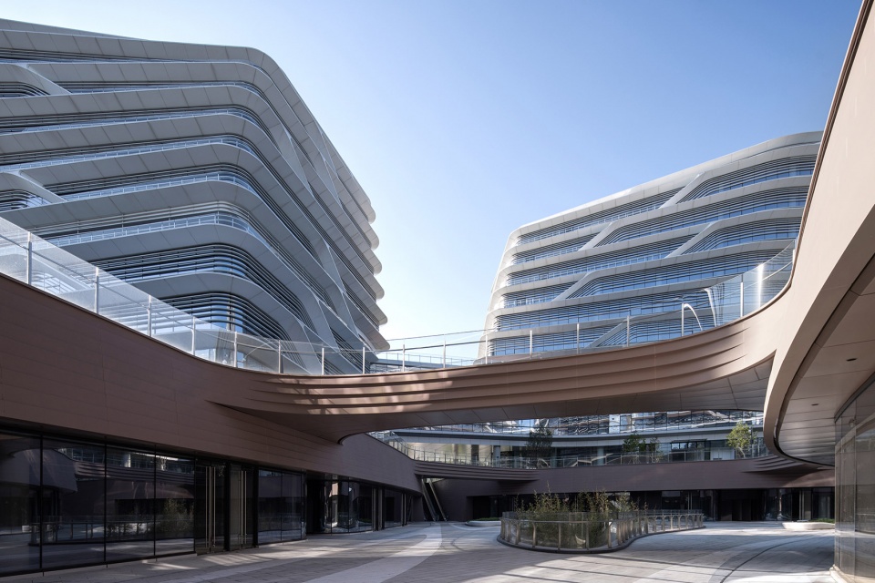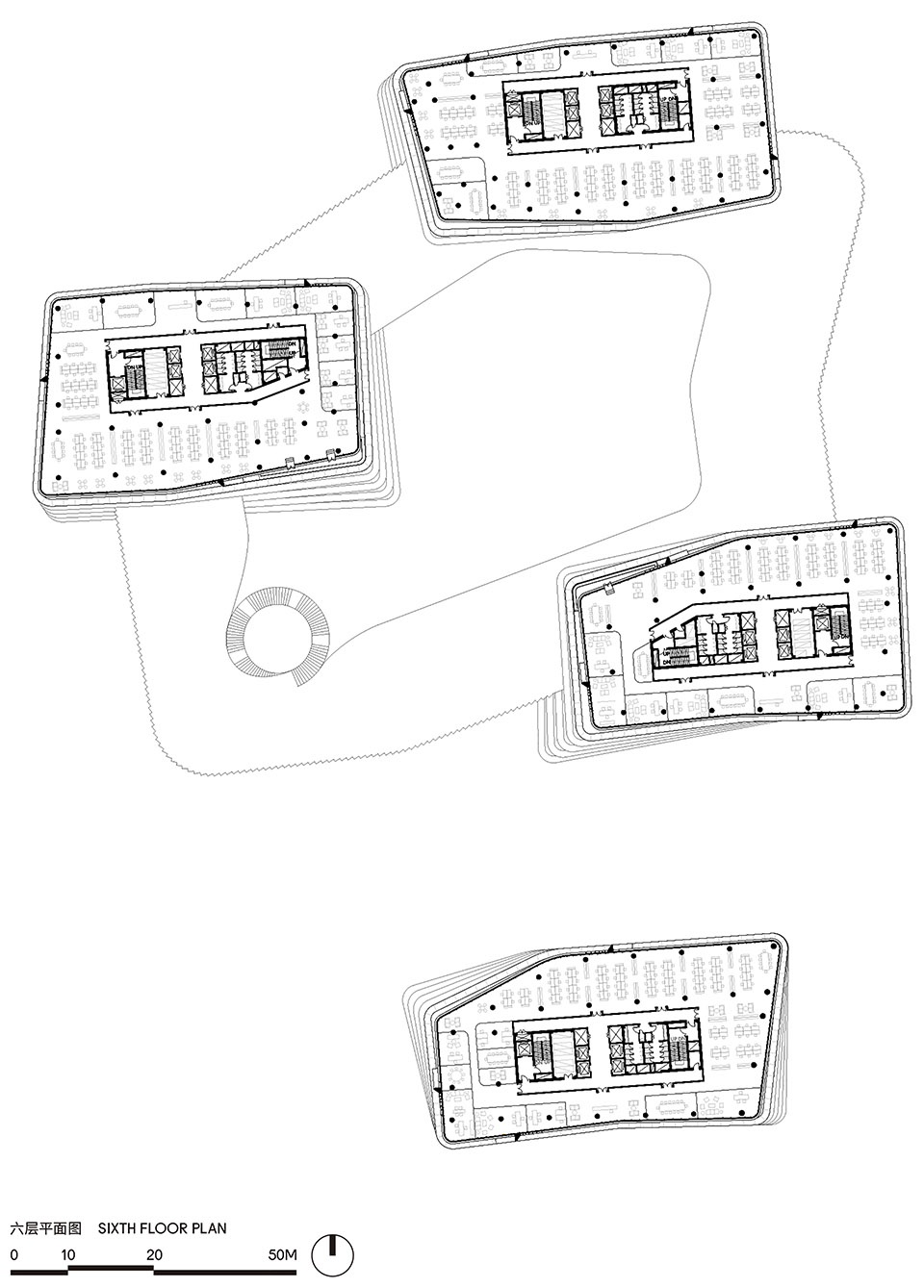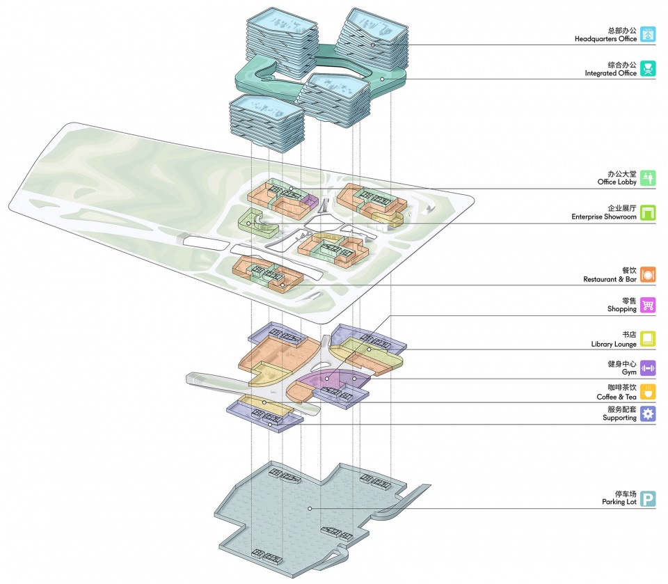 “云环”裙房的底层大面积架空,使一个周长达400米的超大型围合式裙房轻盈灵动的悬浮于地面之上,萦绕在三座塔楼之间。这种塔楼与裙房连接的渗透式空间体系更具弹性,并带来灵动的共享与社交功能。