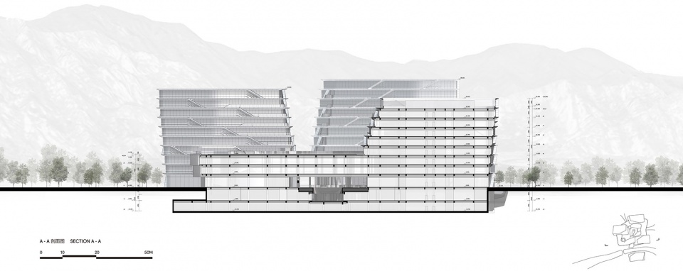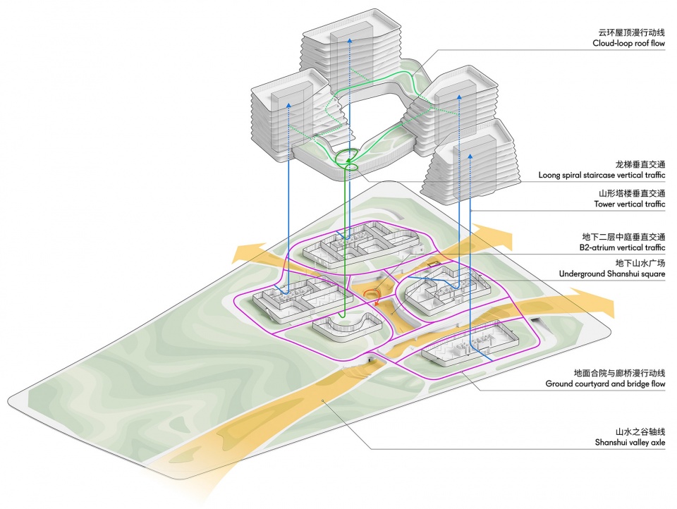 总体规划中的“山水之谷”由西南向东穿过中央绿地公园,川流蜿蜒进入“北·院”,同时将大区域的生态景观引入园中,生长为地下层的“山水广场”庭院。CAA将传统院落布局与自然山水意象相融合,既具有 “合院”之象,又有层峦叠嶂的山形建筑形态,形成“山合院”的设计理念。