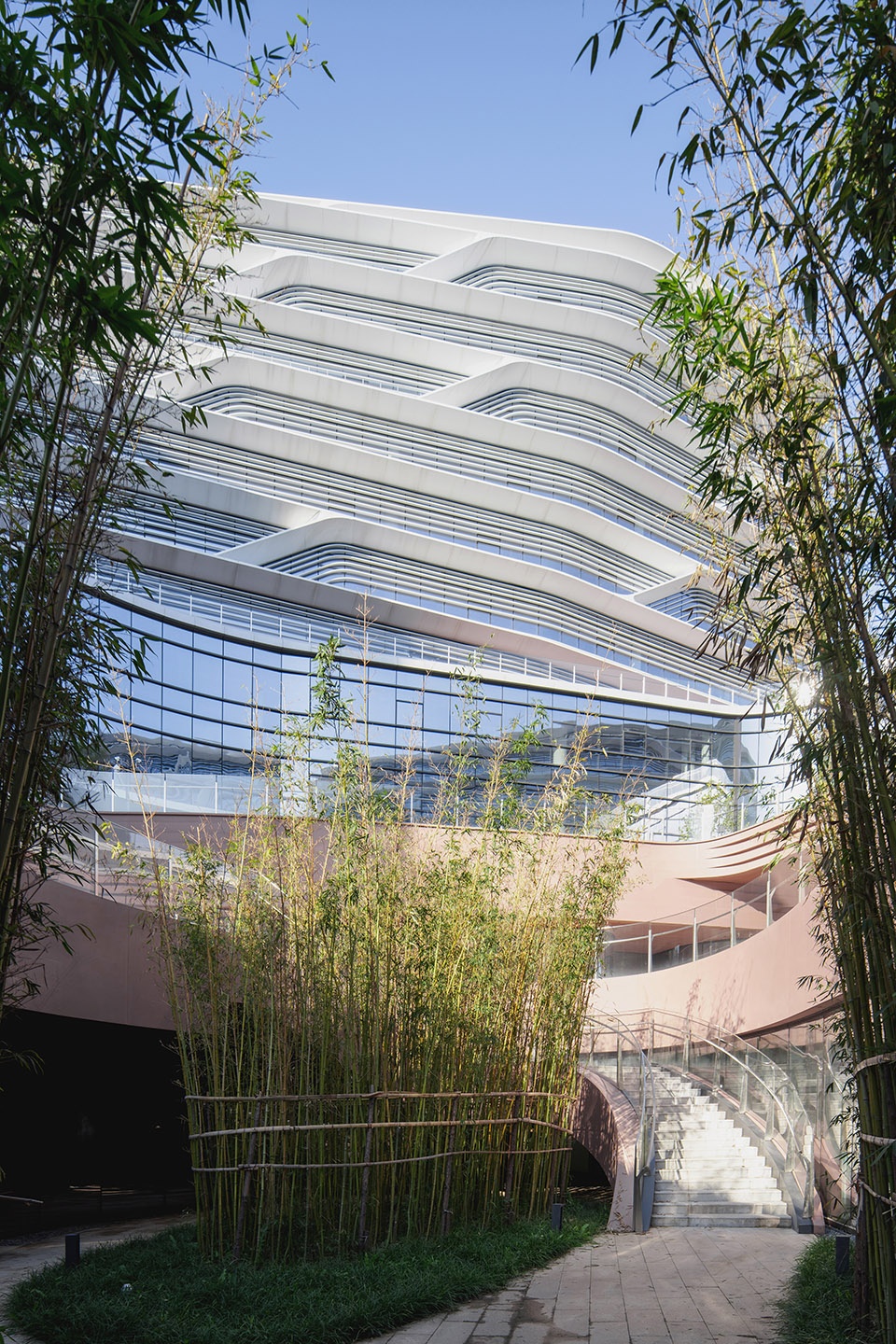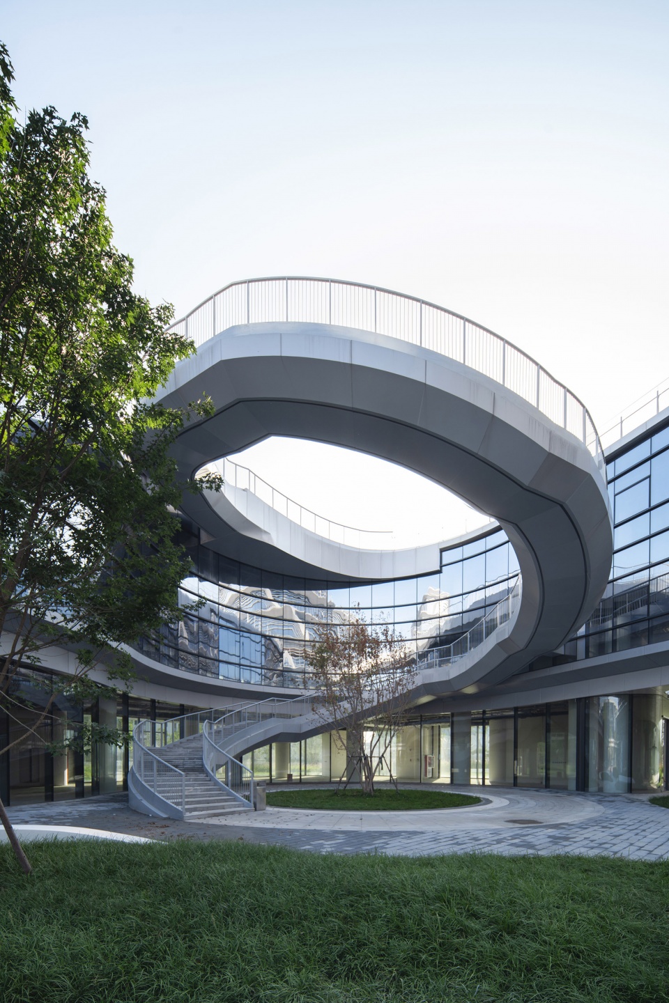 自园区西南的主入口进入云环的内院,人们可以看到一个超大型悬挑钢结构旋转“龙梯”。它既是实现裙房屋顶花园为市民开放,连通地面绿地广场的重要垂直交通,又以流畅的曲线和悬挑的姿态,呈现强烈又优雅的动态美,宛如一条巨龙自地面腾空而起,成为“北·院”一处艺术与技术,美学与功能完全融合的公共艺术装置。
