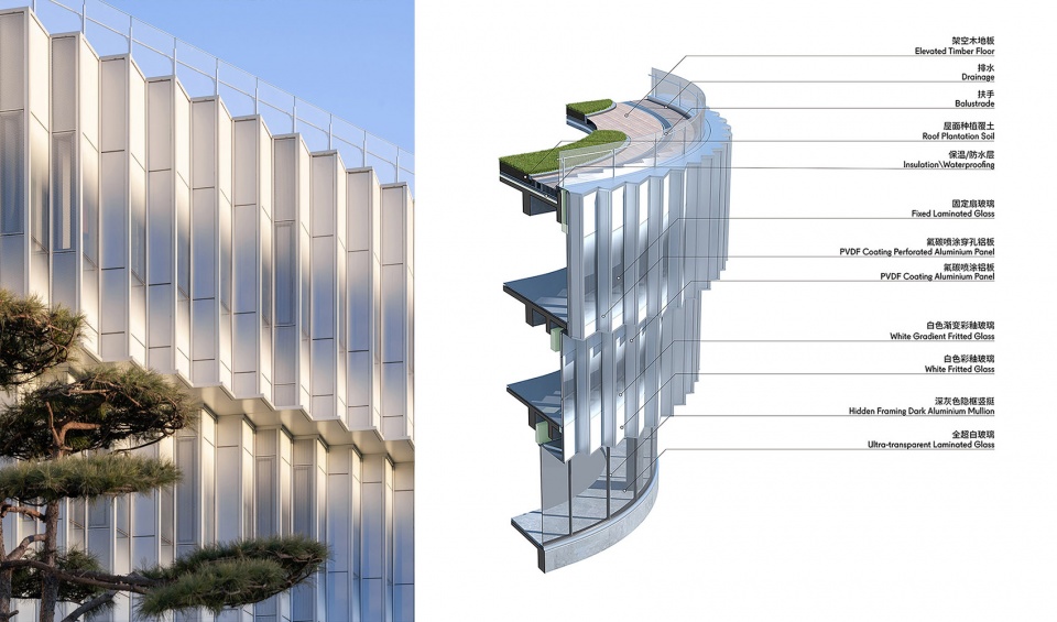 The well-proportioned facade system not only showcases the freehand beauty of natural landscapes but also serves as a well-performed sunshade trellis, realizing sunshading and energy-saving effects for the indoor spaces. It also creates a comfortable lighting experience for office staff by adjusting to the varying light conditions of different seasons and times of day.