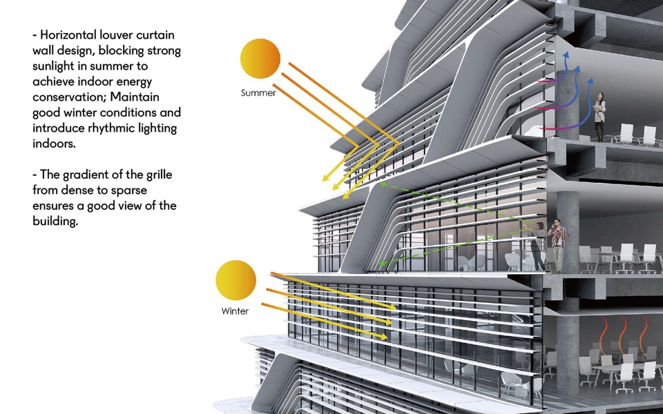 疏密有致的幕墙系统不仅展现山水自然的写意之美,更具有高性能遮阳格栅的功能,实现了建筑室内空间的遮阳与节能效果,并根据不同季节与时段的光线变化,为办公人群带来舒适的光影体验。