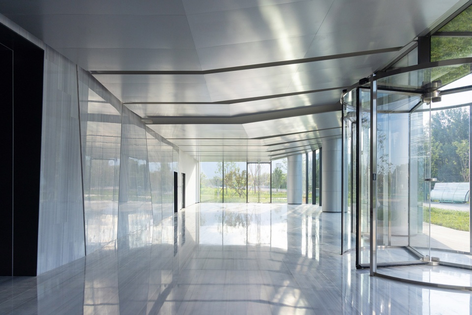 室内公共空间的设计延续了建筑 “山、水、云”的理念。首层建筑幕墙采用高透超白玻璃,从视觉上消隐了建筑内外的边界,带来了室外自然与室内景观的融合。