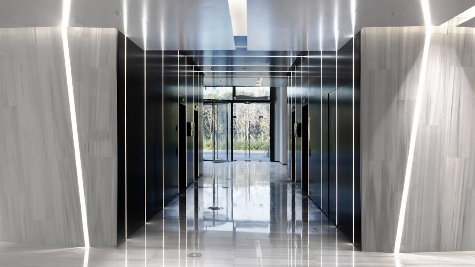 大堂尽可能通透开放,唯一的核心筒墙面使用水云纹大理石板拼接而成,线性灯光从角度不断变化的石板缝隙中透射出来,仿佛一种强烈的内在能量即刻从开裂的山石中迸发而出。有机韵律的阳极氧化铝板将顶部复杂的机电设备巧妙的隐藏在顶部,同时如山间的水波荡漾,空间的艺术性与功能性结合在这里得以展现。