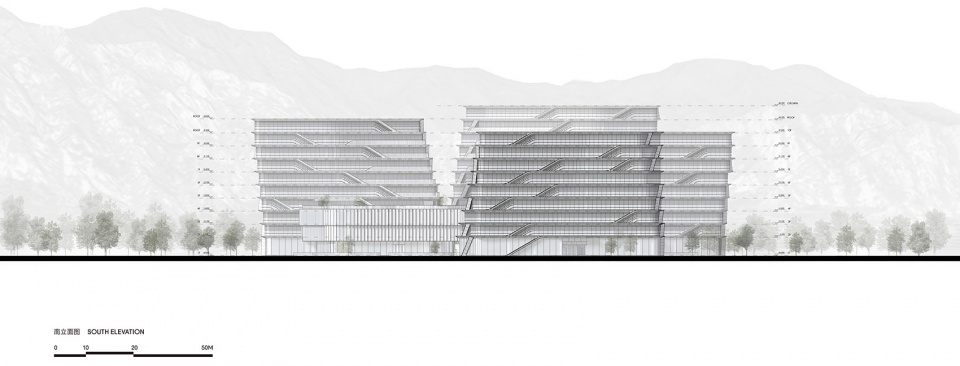 山形塔楼从地面升起,围合式的裙房又如“云环”系于山间,构筑成合院式平行空间界面。整体建筑群形态与西山展开对话,以中国传统人文与哲学思想为基底,将东方山水意象与未来建构相融,由山川、河谷、院落共同营造出了未来主义的东方浪漫。