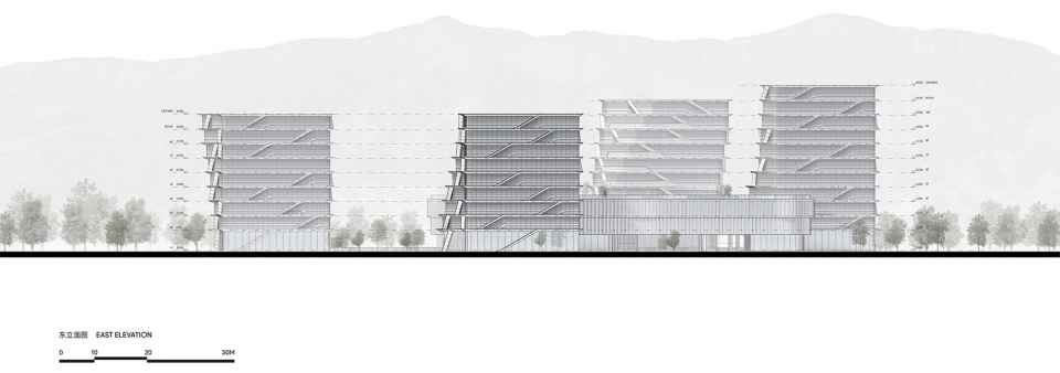 CAA为“西山智谷”总体项目建构了完整的绿色可持续性体系。以 “山水之谷”构筑的立体绿色环廊将“西·山、北·院、东·川”三大地块的自然景观互联互通,并向周边自然环境延伸,形成一个城市尺度的绿色生态网络。