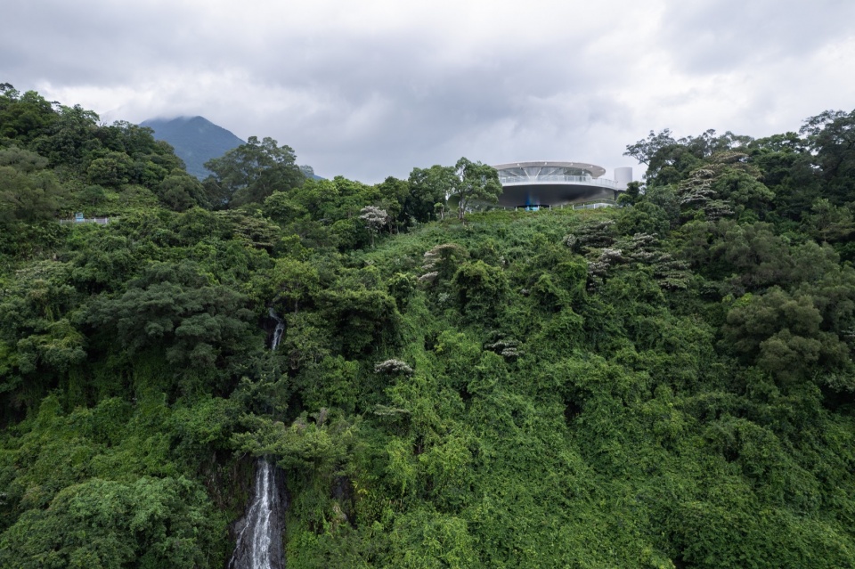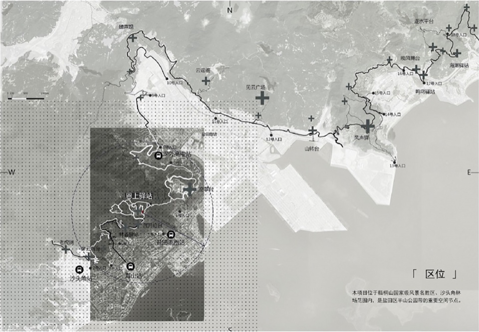 项目位于盐田区梧桐山顶恩上湿地公园,在这里一边是梧桐山恩上湿地的山顶景观,一侧是盐田港海面延绵不绝的“海外仙山“以及港口同样延绵不绝堆叠的集装箱。自然与人工的奇观几乎在这里同时呈现。