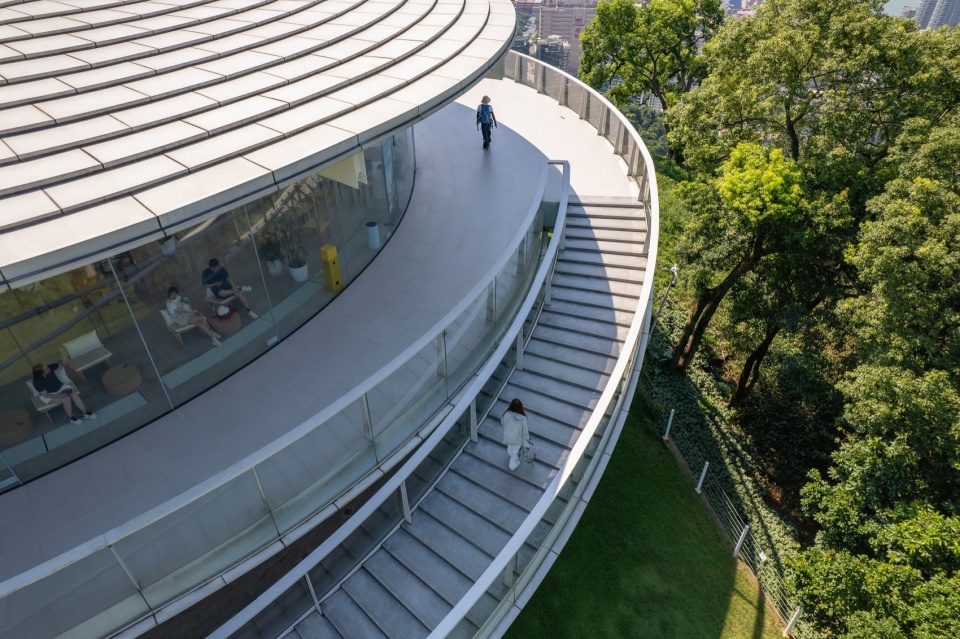 The ascent follows a winding path, unfolding a captivating landscape along the way. To preserve the intimate experience of this journey, the siting strategy deliberately retained a grove of trees just before reaching the plateau, obscuring the building upon approach. Through meticulous calibration of the building’s scale and height, it remains partially hidden and screened at the entry sequence, achieving a sense of concealment. On the opposite side, however, the station marks the terminus of the mountaintop Enshang Wetland Park—a spatial node opening onto an expansive green field. Here, the building presents itself in its complete form, establishing a clear visual terminus and creating a deliberate spatial counterpoint within the open landscape. This interplay of hiding and revealing orchestrates a sequenced approach that heightens the visitor’s spatial awareness.