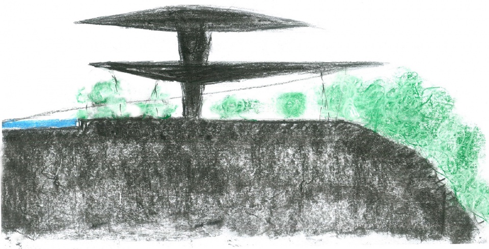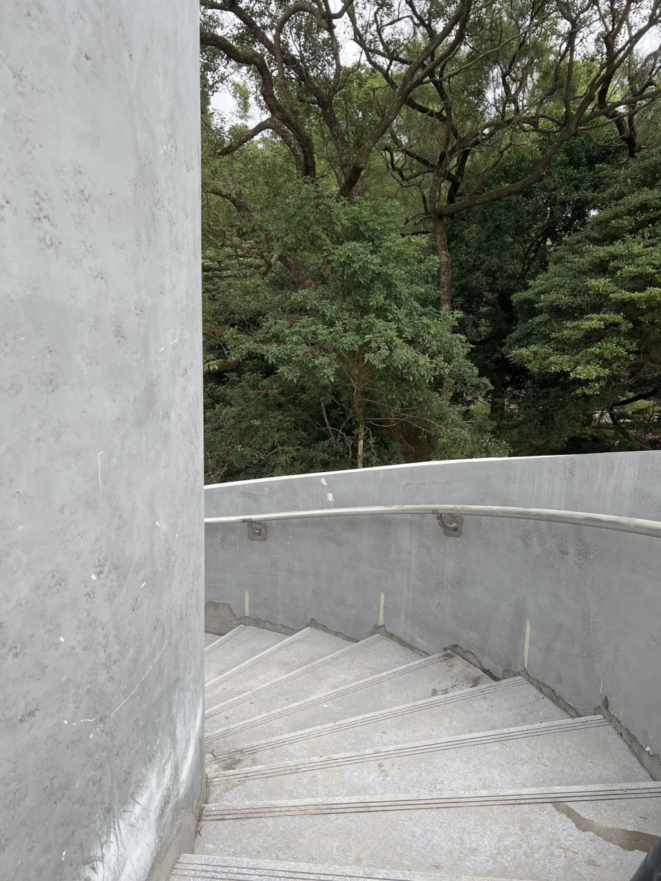 To achieve the panoramic view, a circular plan was adopted: a circular gathering space at ground level, a circular platform on the second floor, and a circular roof. Three circles with different radii (16m, 13m, and 19m, respectively) are positioned with offset centers around the central structural column. This deliberate misalignment creates varying overhangs, introducing a dynamic, slightly unstable spatial sensation. The largest cantilever extends towards the sea, forming an expansive outdoor platform that serves as a public viewing deck. A single-flight curved staircase guides movement and view in a rotating sequence—from the mountain, through the trees, and finally towards the ocean horizon. Service spaces, including restrooms, an elevator, and mechanical equipment, are consolidated on the north side. Partially embedded into the slope in a semi-sunken configuration, their exposed upper volumes form steps that connect with the ground level. Encircling the central column, these elements create a sheltered, semi-outdoor amphitheater at the ground floor.