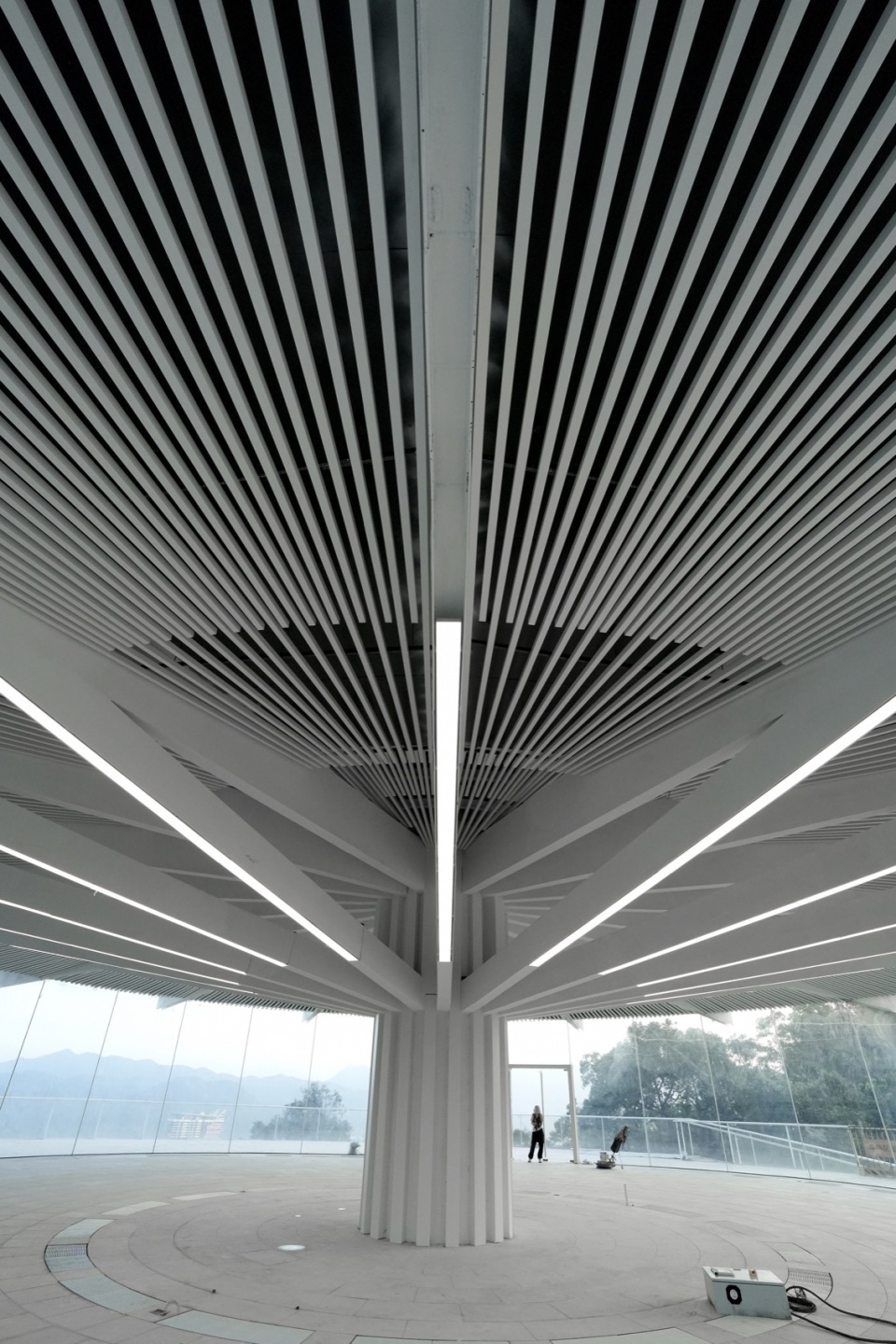 Shenzhen is a city of migrants. Everyone who arrives here, much like dandelion seeds, settles and takes root, becoming a part of the city. Using the imagery of “Dandelions in the Mountains,” we aimed to create a gathering place. The design highly integrates equipment and structure: the variable cross-section “structural cavity” of the second-level floor slab is rationally utilized to accommodate underfloor air conditioning supply, drainage, electrical conduits, and other services. A hydraulically operable skylight is centrally placed on the roof to exhaust hot air from the interior when temperatures rise. The channels of the I-beam sections within the roof truss are repurposed as lighting troughs. The perimeter glazing employs single-pane curved glass panels that are self-supporting, ensuring unobstructed panoramic views and a sense of transparency from the interior.The ceiling for the second-level roof, which must conceal equipment and conduits, features a white gridded drop ceiling aligned with the radial pattern of the main beams, realizing the spatial metaphor of the “dandelion.” The sizing of the steel structural members carefully balances the ease of factory prefabrication, transportation constraints, and the project’s requirements for precision and economy.